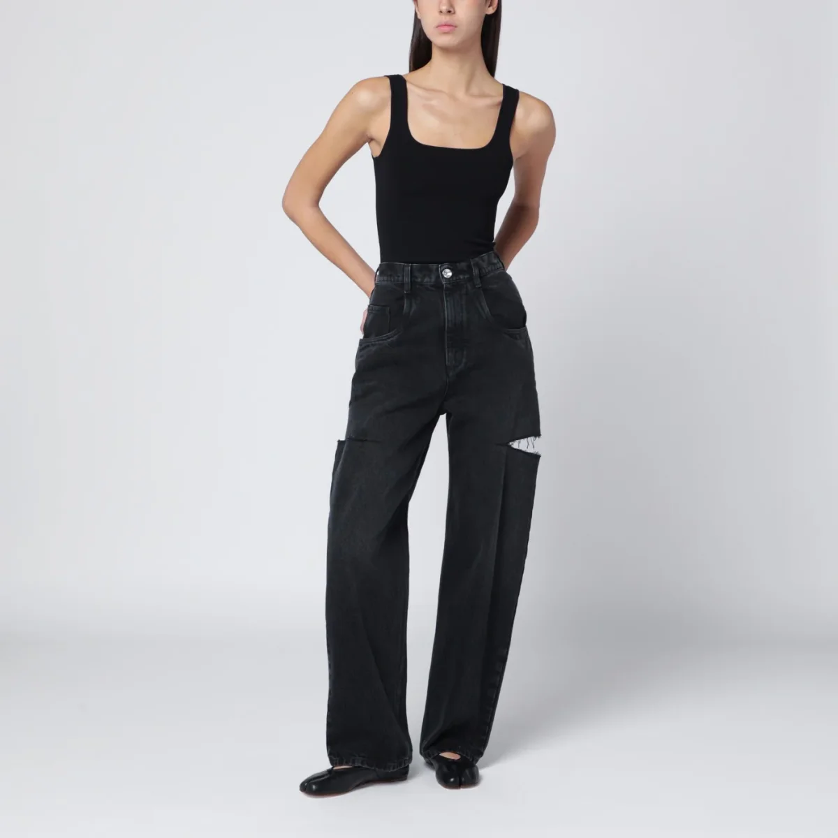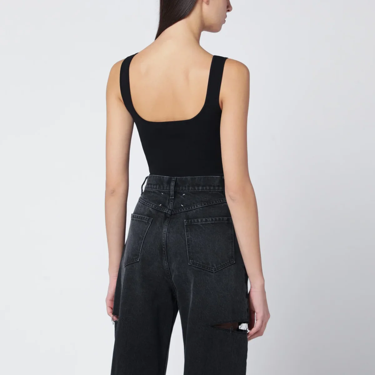 Top di Entire Studios in misto viscosa nero, caratterizzato da ampio scollo sul davanti e sul retro, spalline piatte e bordi a costine.