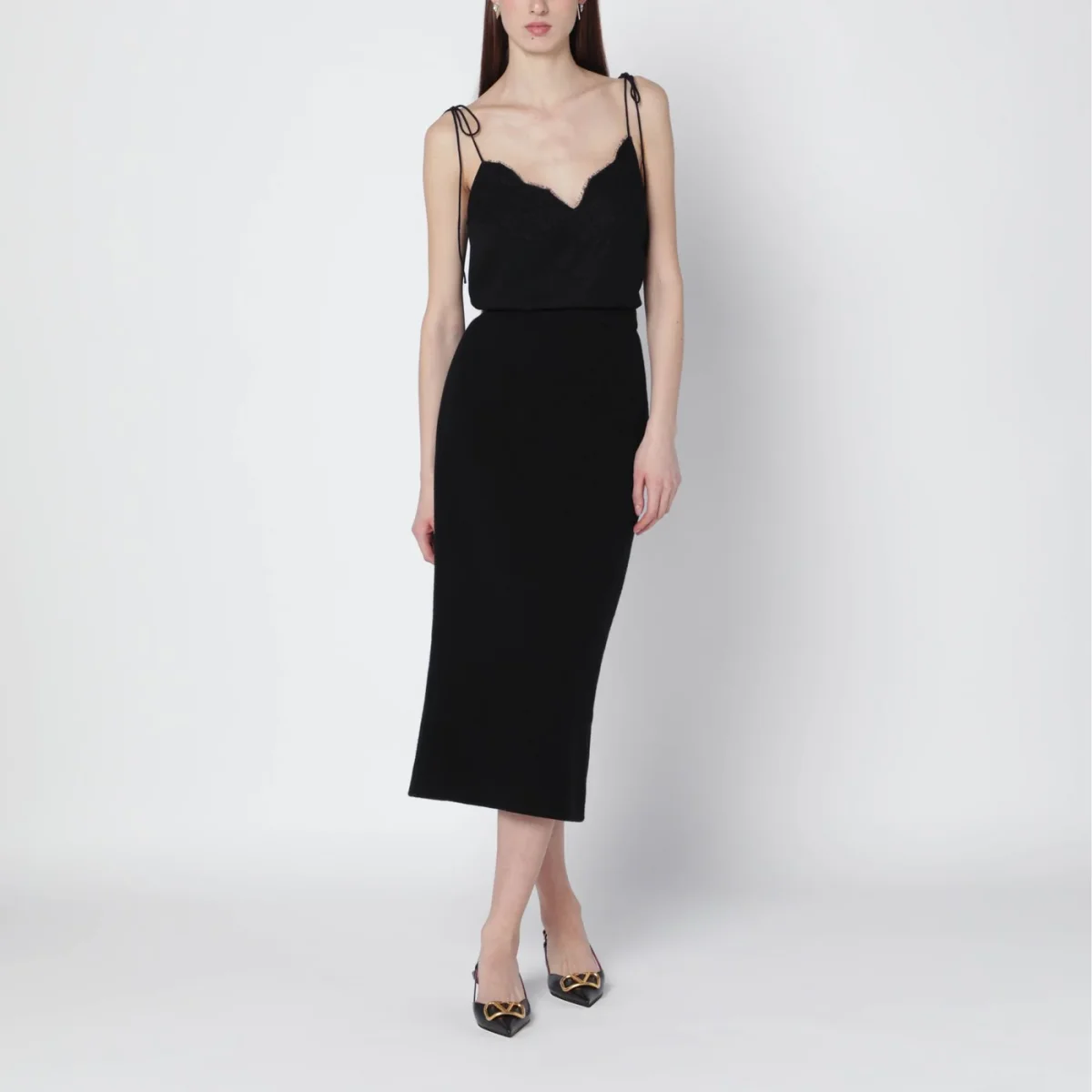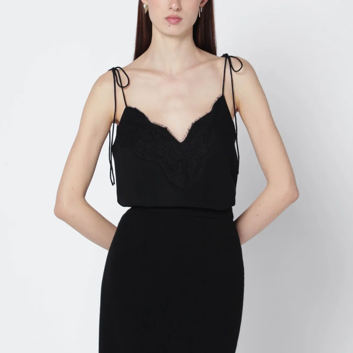 Top di Valentino in seta nero• spalline sottili annodate• dettagli in pizzo tono su tono• scollo a V sul davanti e sul retro• chiusura posteriore con bottoni ricoperti