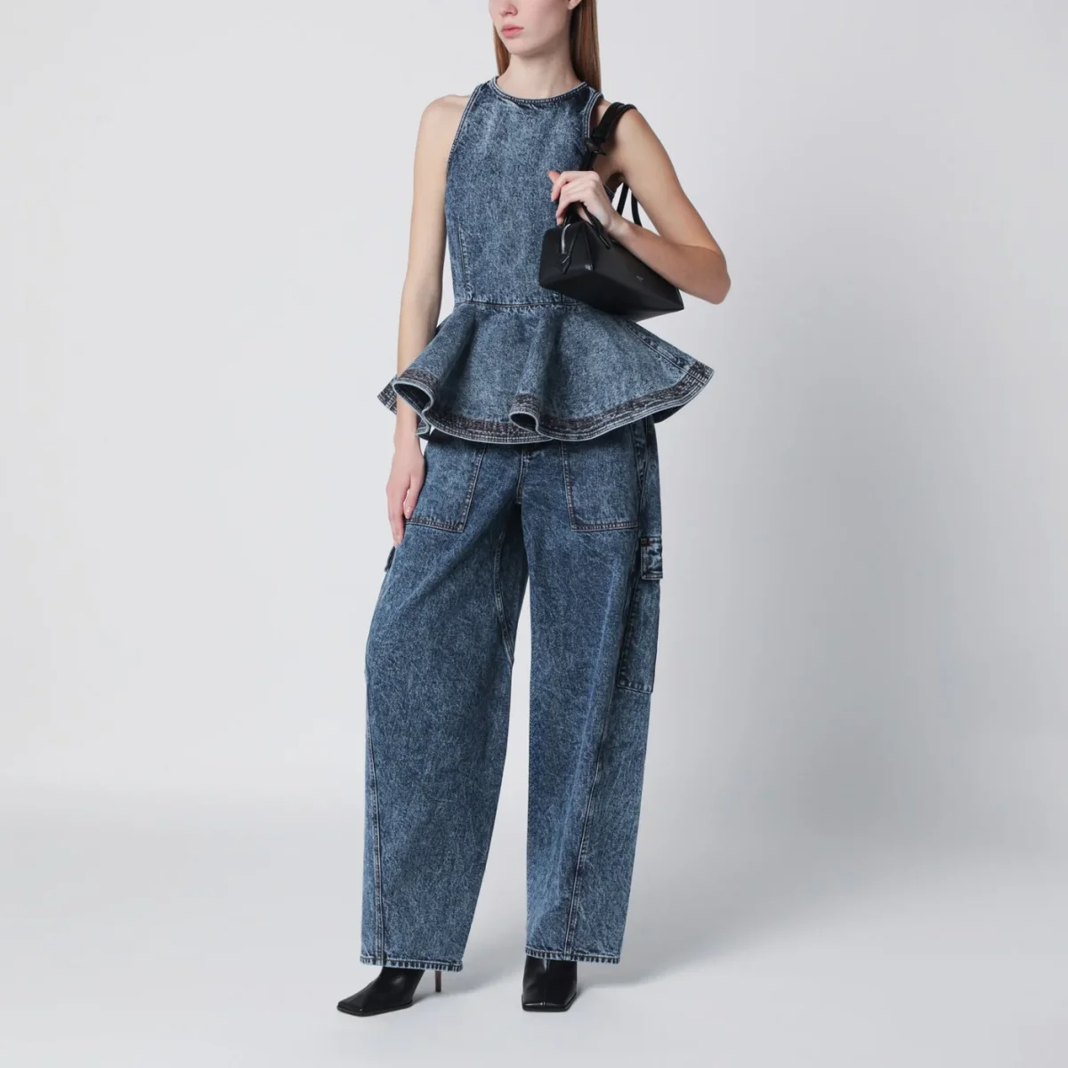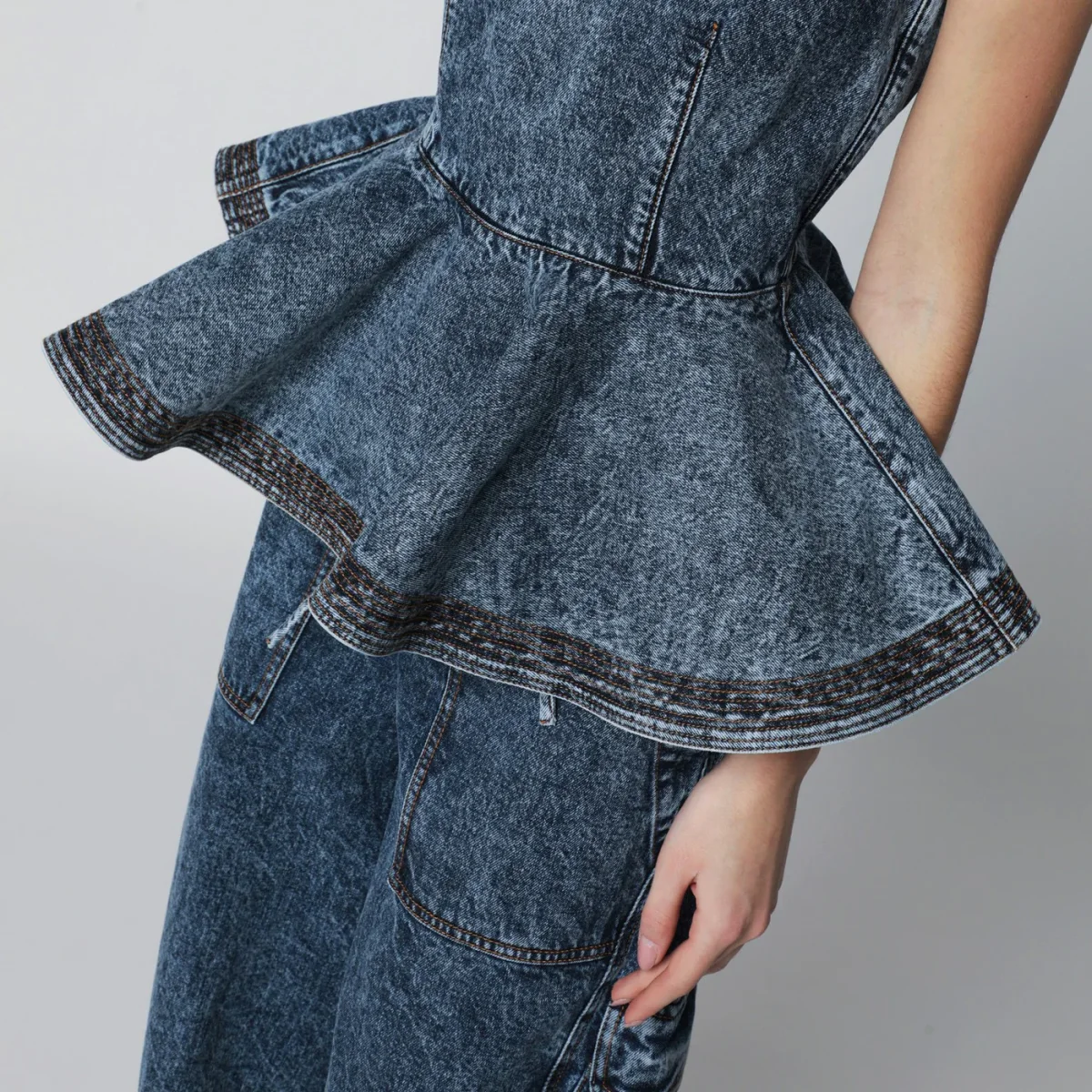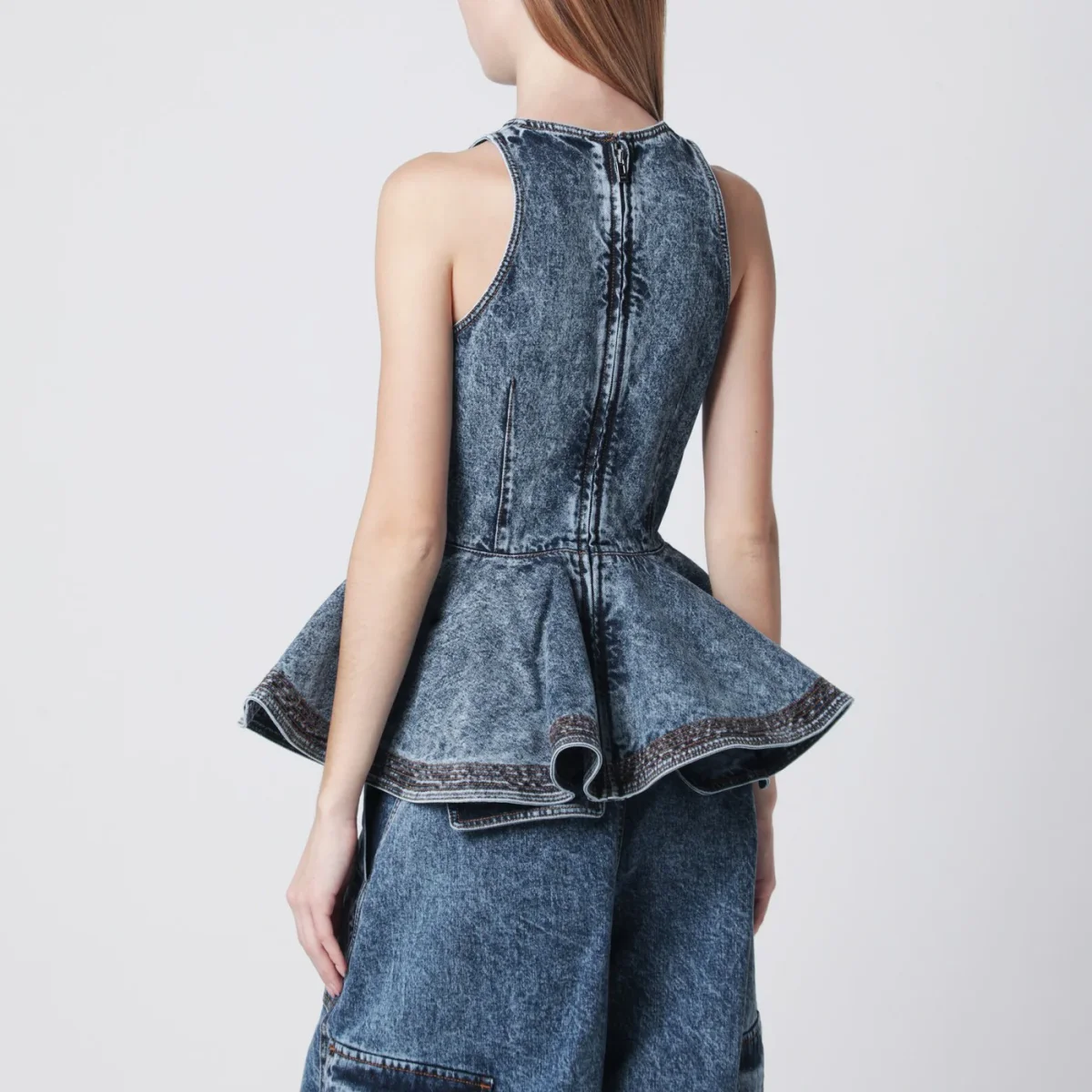 Top Peplum di Alaïa in snow denim• Scollo All’Americana• Senza Maniche• Fondo Con Ruche• Silhouette Aderente E Svasata• Sciancrata In Vita• Chiusura Con Zip• Parti Metalliche In Argento