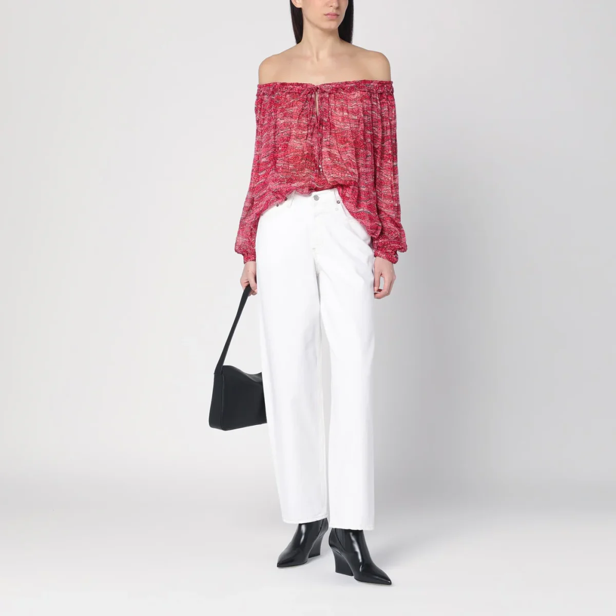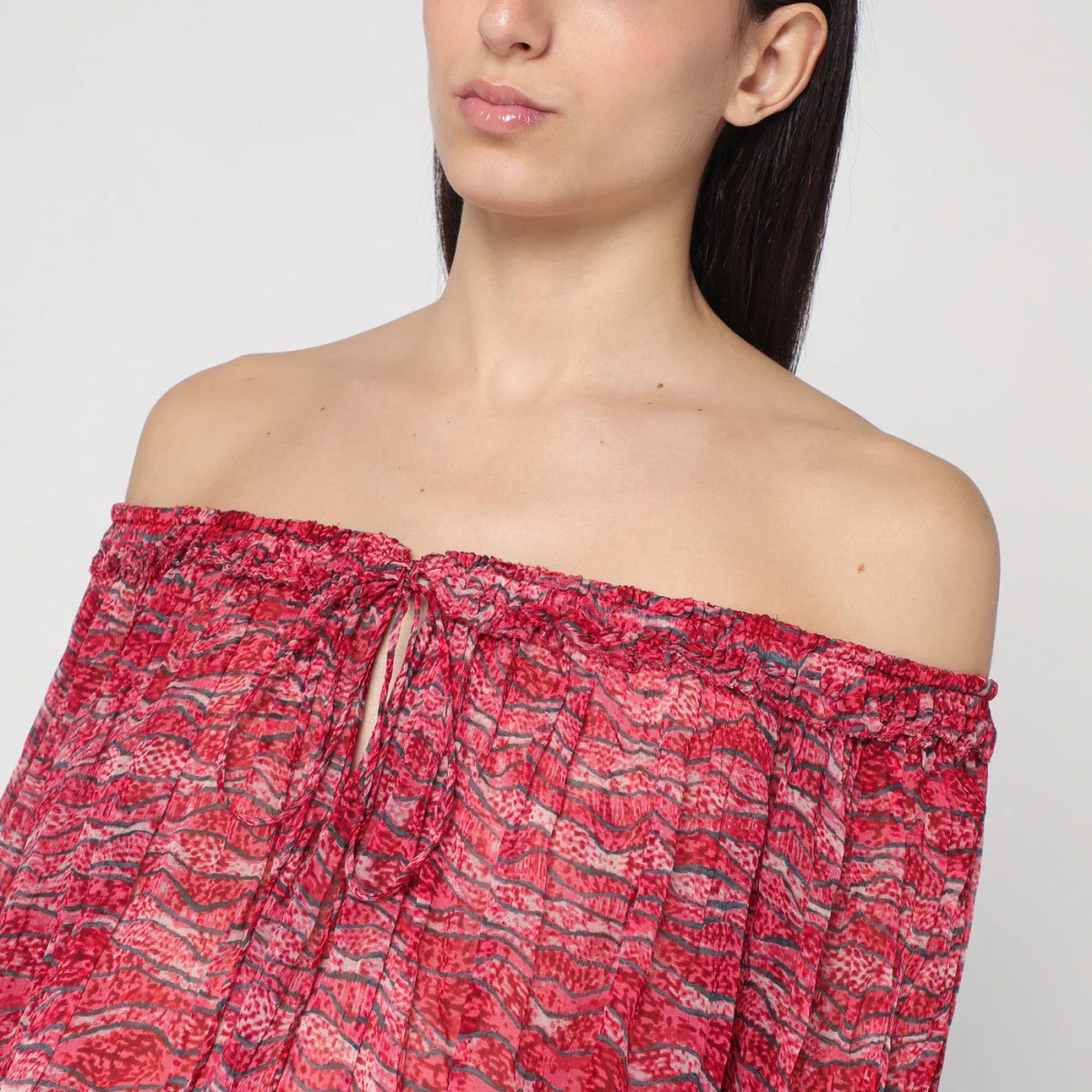 Top di Isabel Marant Étoile in viscosa rosso con stampa all over, caratterizzato da spalle scoperte con fascia elasticizzata e fiocco e manica lunga con polso elasticizzato.