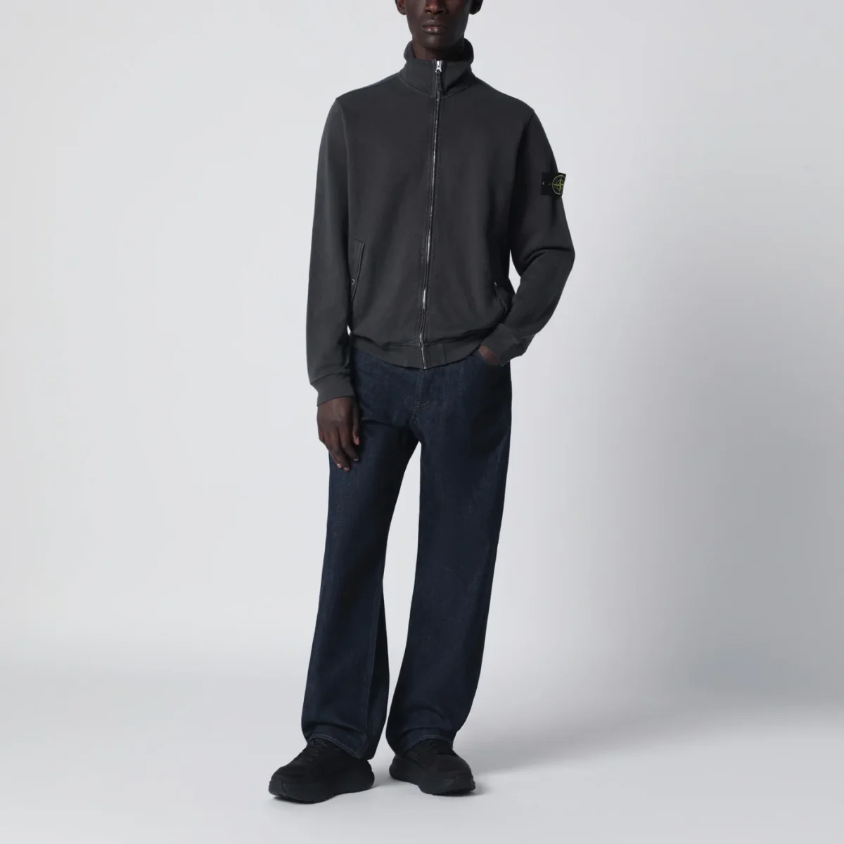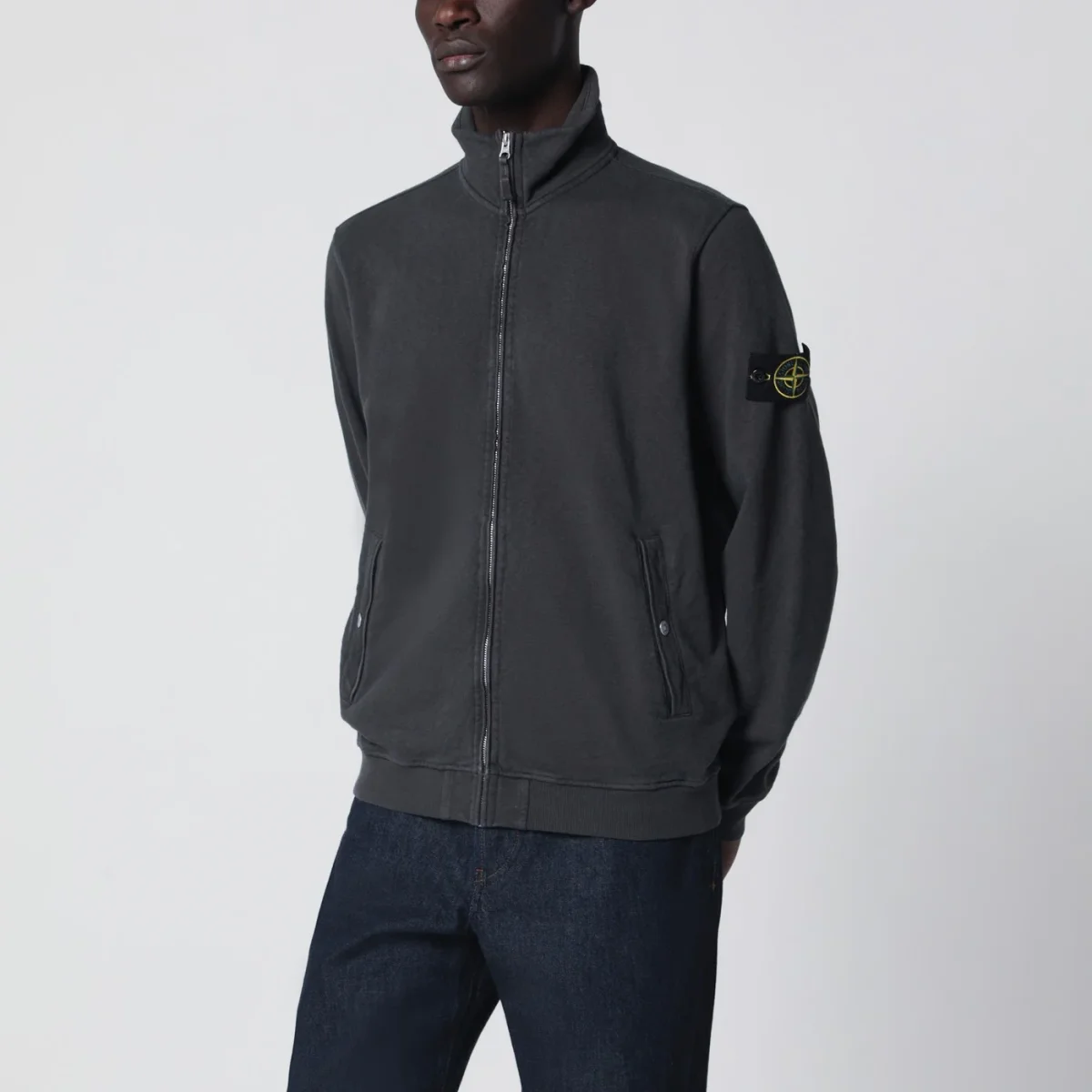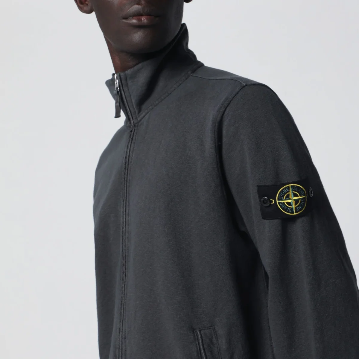 Track jacket di Stone Island in felpa di cotone grigia• Tasche oblique con bottone automatico• Maniche lunghe di cui una con etichetta logo Compass• Bordi a costine• Chiusura con zip• Vestibilità regolare