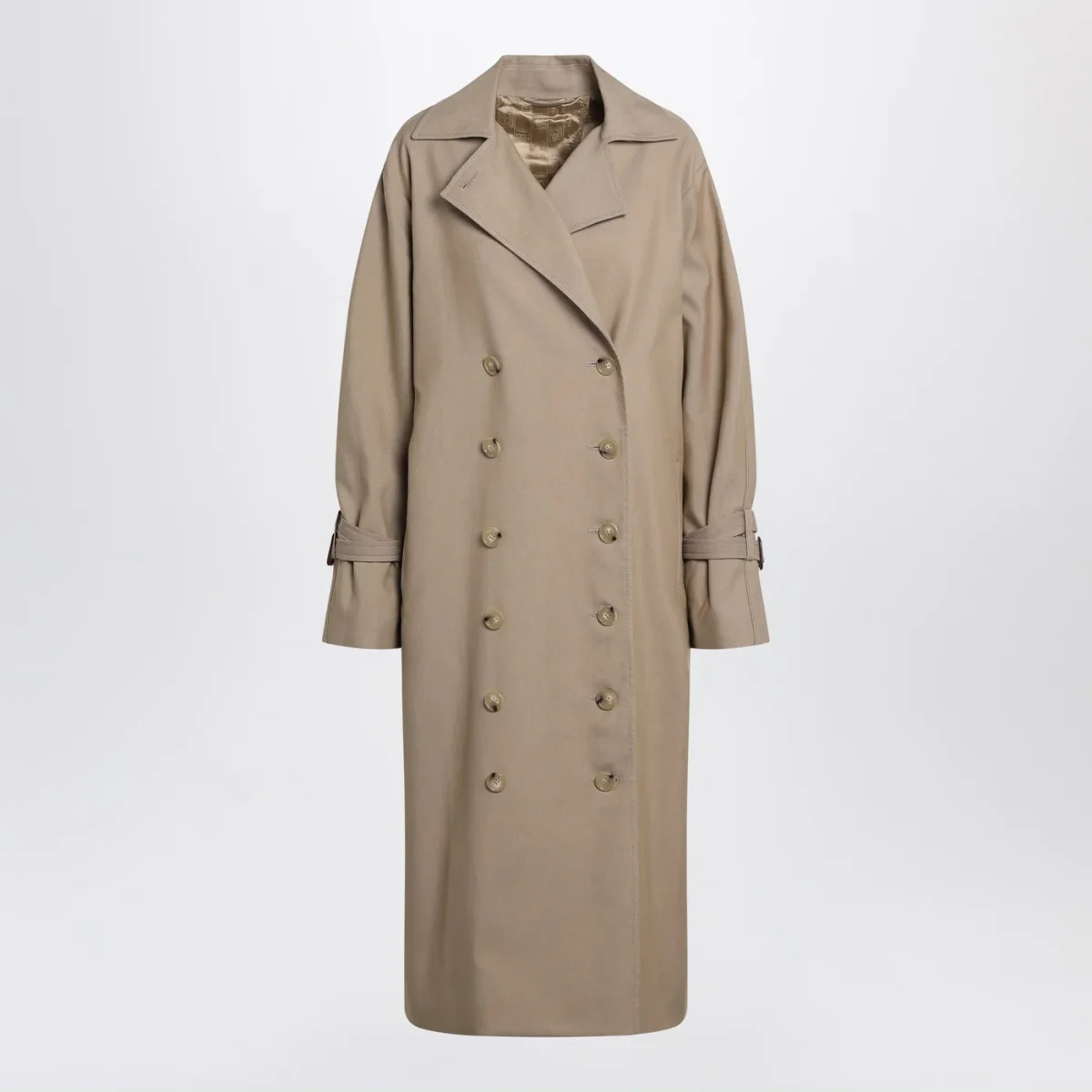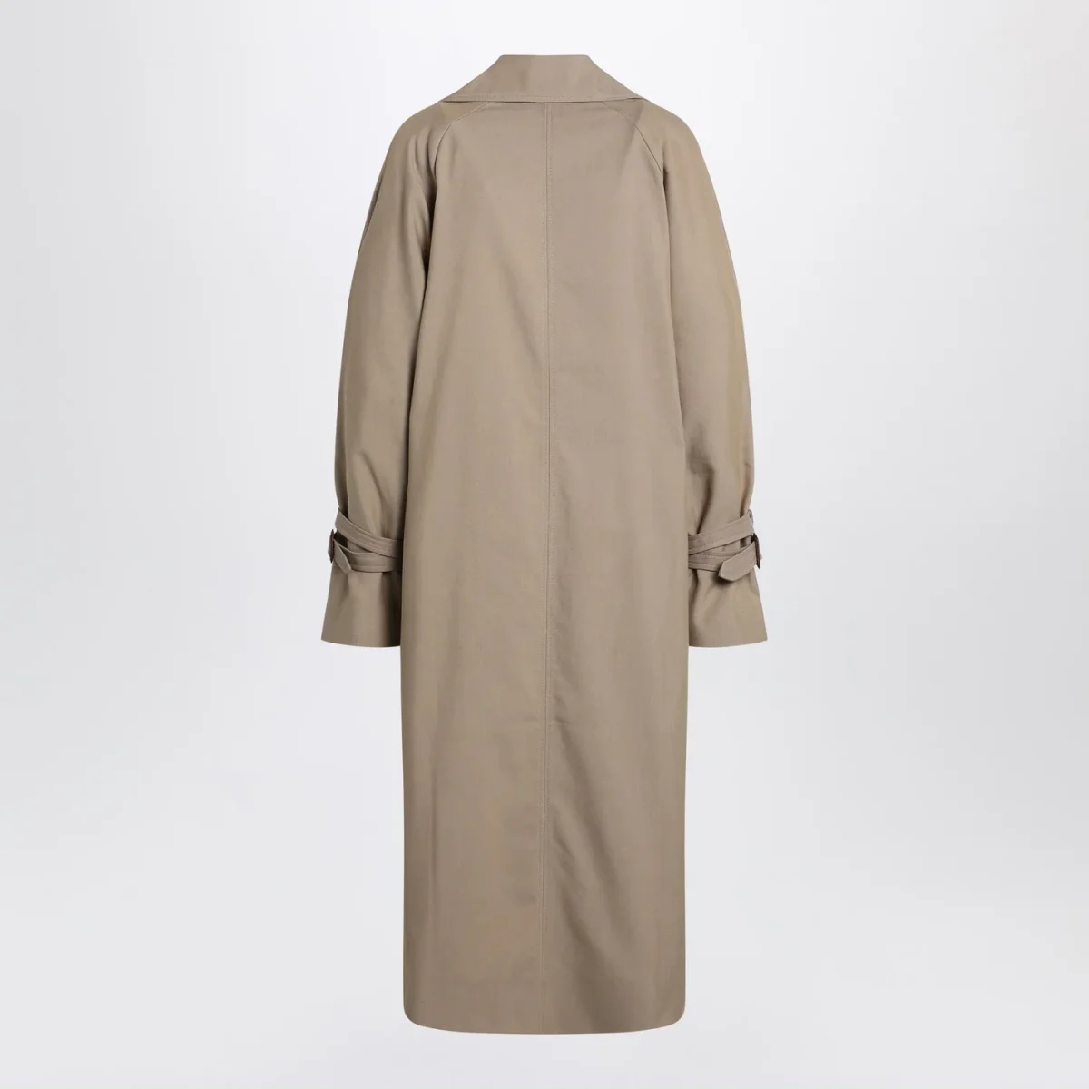 Trench coat lungo doppiopetto in misto cotone beige kaki di TOTEME caratterizzato da maniche lunghe con polsini regolabili, una patta frontale con bottoni, revers classico e due tasche laterali a filetto.