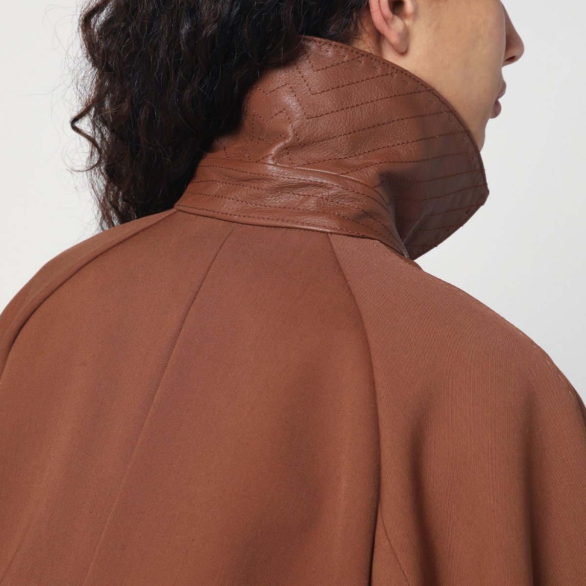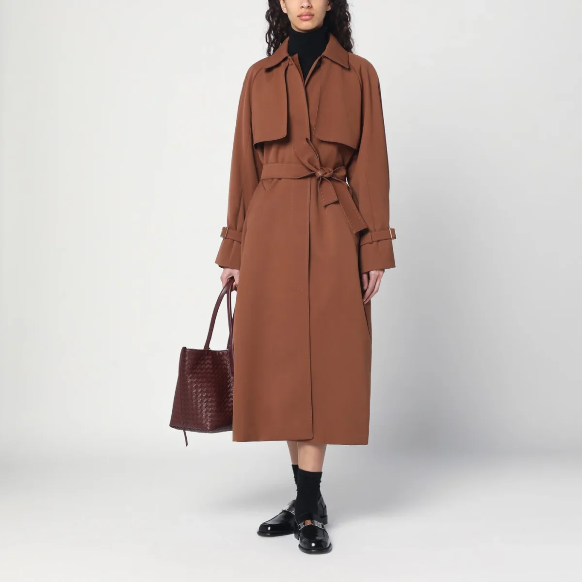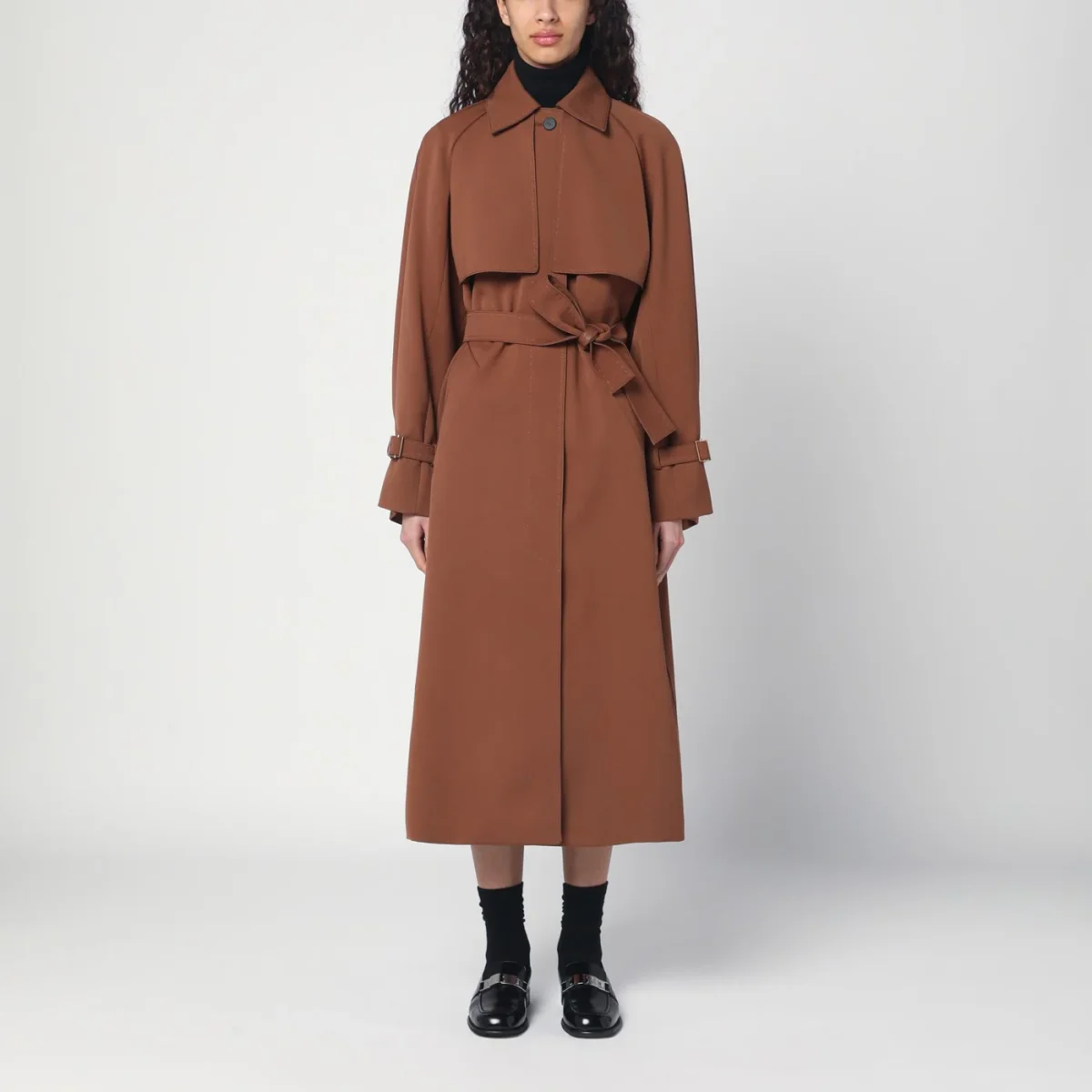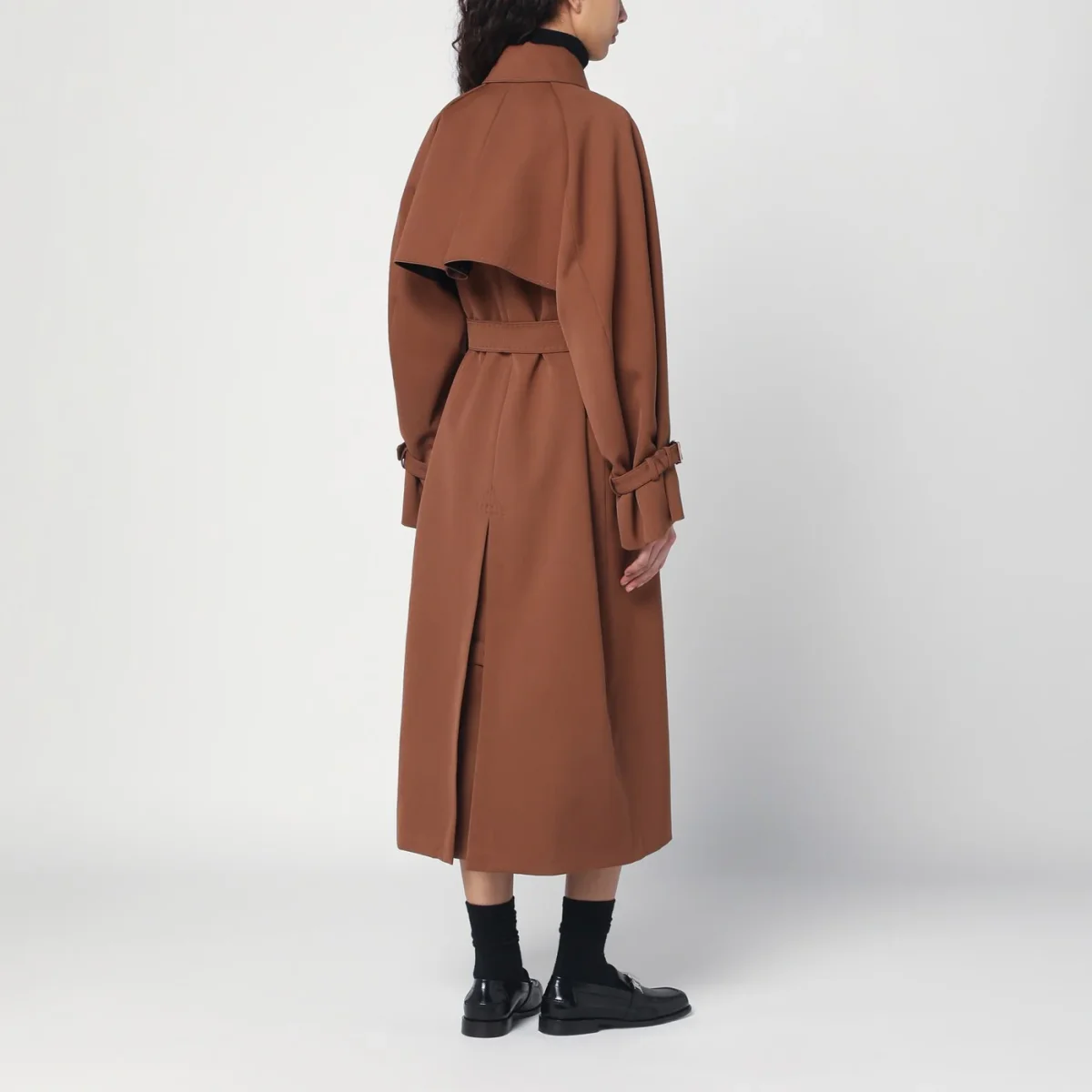 Trench oversize di Max Mara Atelier in gabardina antigoccia di misto lana marrone, caratterizzato da ampio sprone posteriore, bavolette frontali, manica lunga con alamari, due tasche a filetto laterali, dettagli in pelle, chiusura con bottoni, cintura abbinata in tessuto e pelle e spacco posteriore.