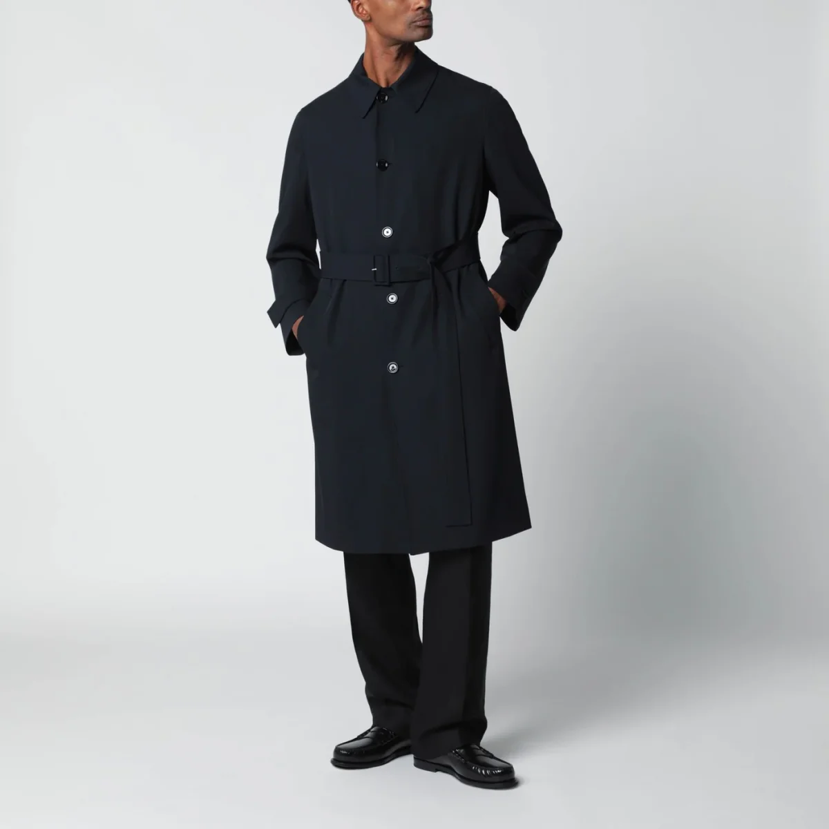 Trench monopetto di Lardini in lana vergine blu• chiusura frontale con bottoni• maniche lunghe con polsini regolabili con fettuccia• cintura in vita regolabile• due tasche laterali• patch con logo sul retro• spacco posteriore