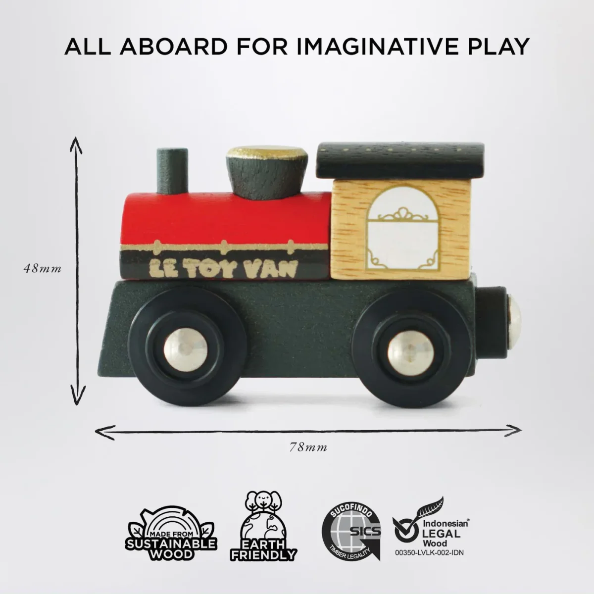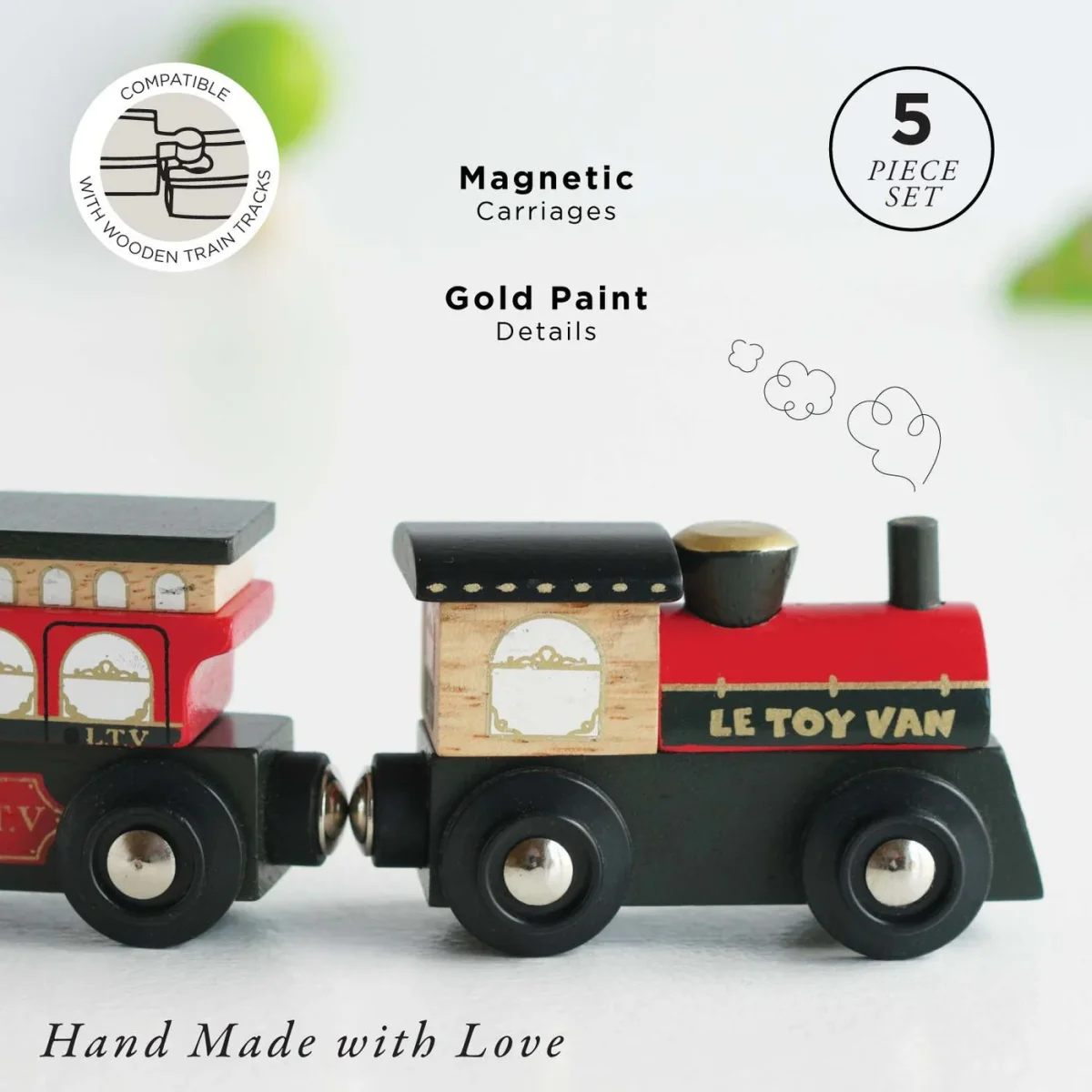 Trenino giocattolo di Le Toy Van in legno certificato dipinto con colori a base d’acqua sicuri per il bambino, composto da cinque vagoni magnetici staccabili.