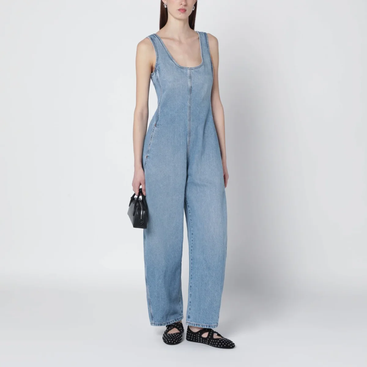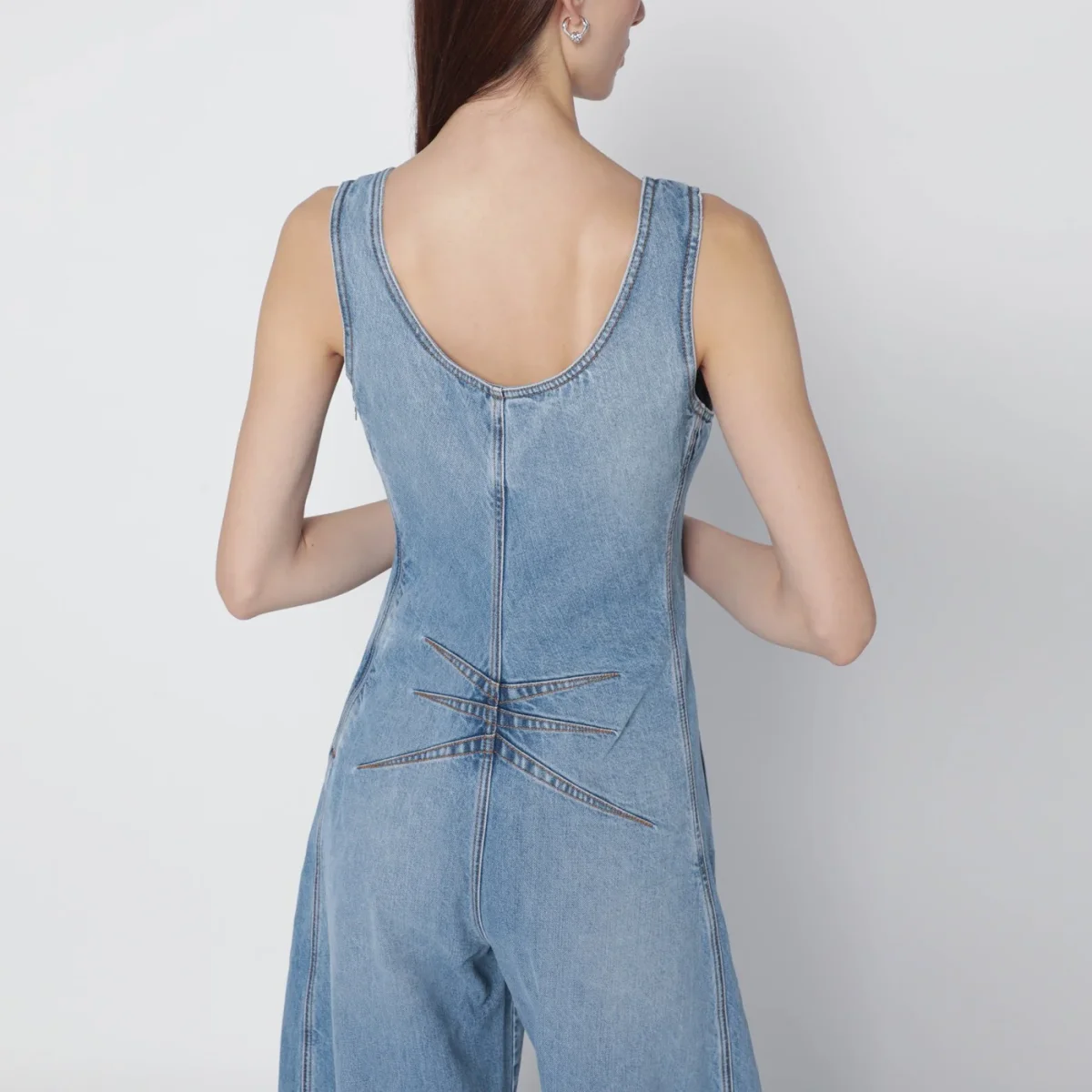 Tuta senza maniche di Alaïa in denim di cotone blu chiaro délavé• gamba con forma arrotondata• ampio scollo• chiusura laterale con zip• cuciture a vista• due tasche laterali