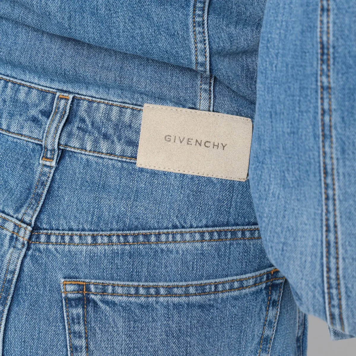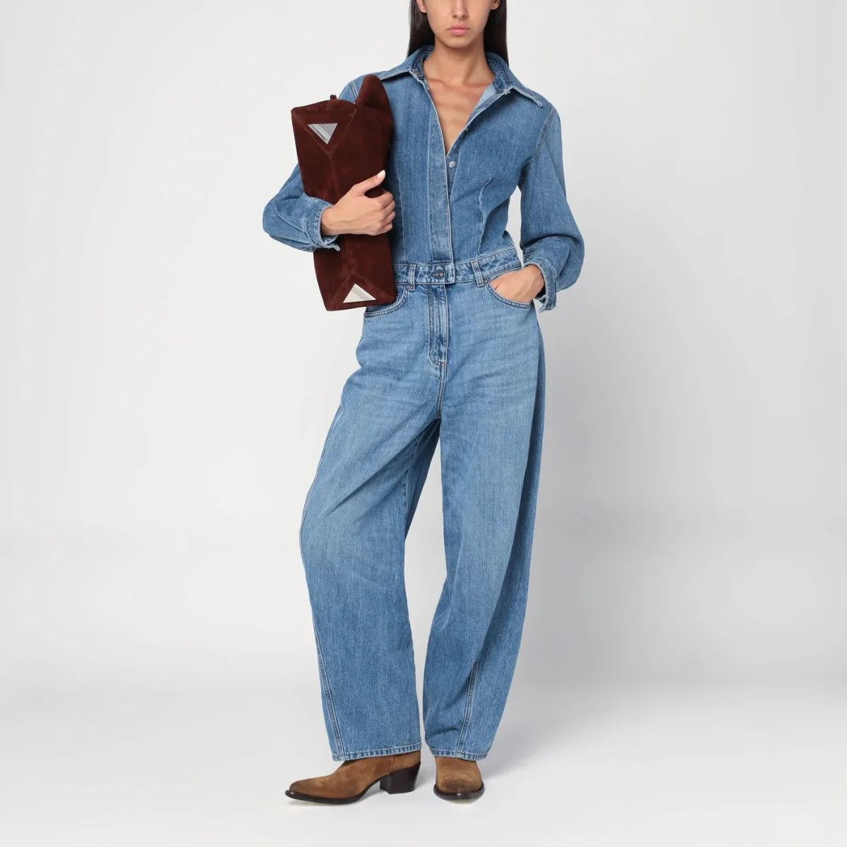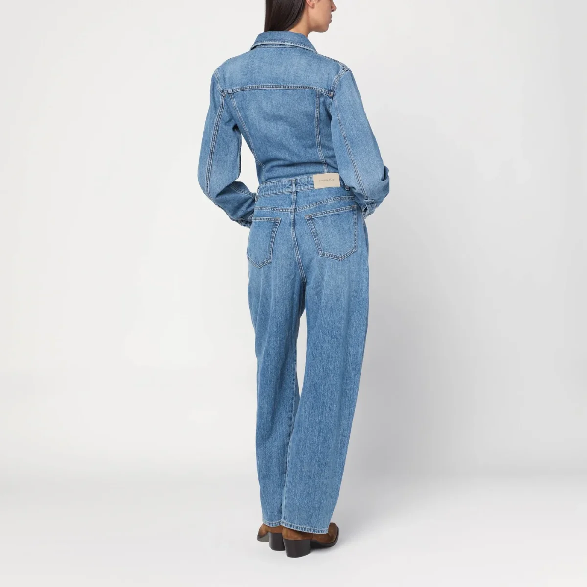 Tuta di Givenchy in denim di cotone blu medio, caratterizzata da maniche lunghe con polsi con bottoni, abbottonatura frontale nascosta, due tasche applicate sul retro, cuciture a vista, patch logo posteriore e gamba ampia.