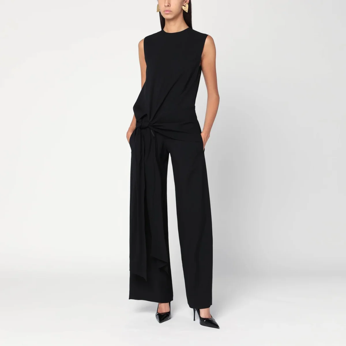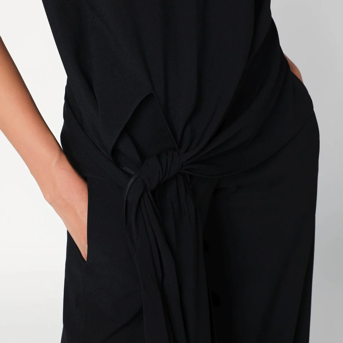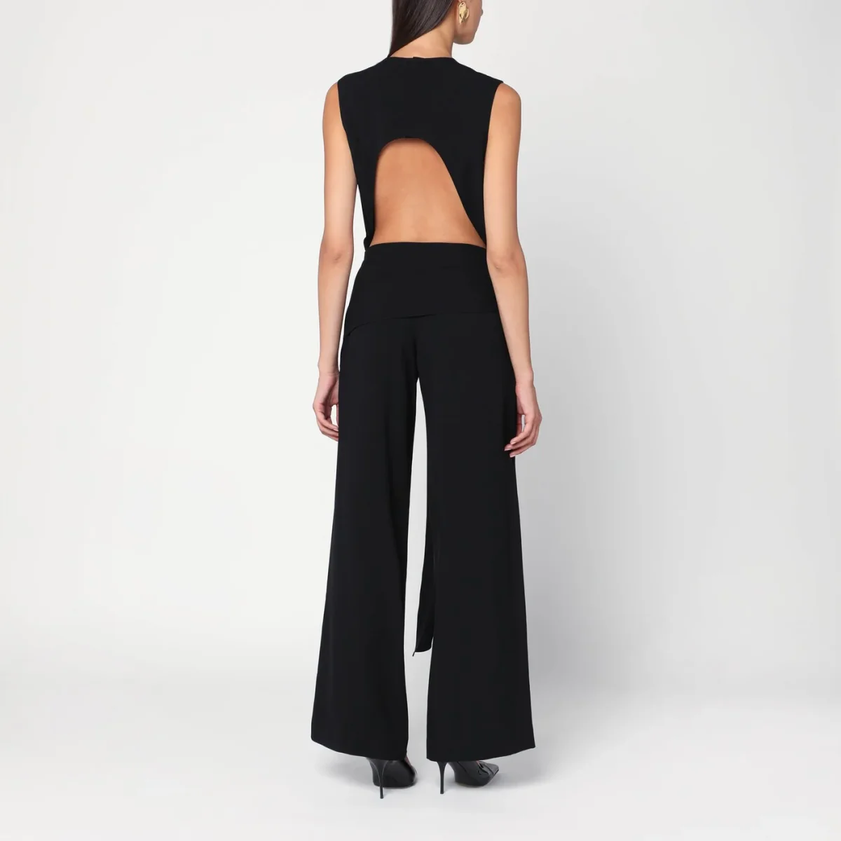 Tuta intera nera di Alaïa crepe di viscosa nera, caratterizzata da fusciacca annodata in vita, design girocollo, senza maniche, chiusura sul retro e apertura sulla schiena.