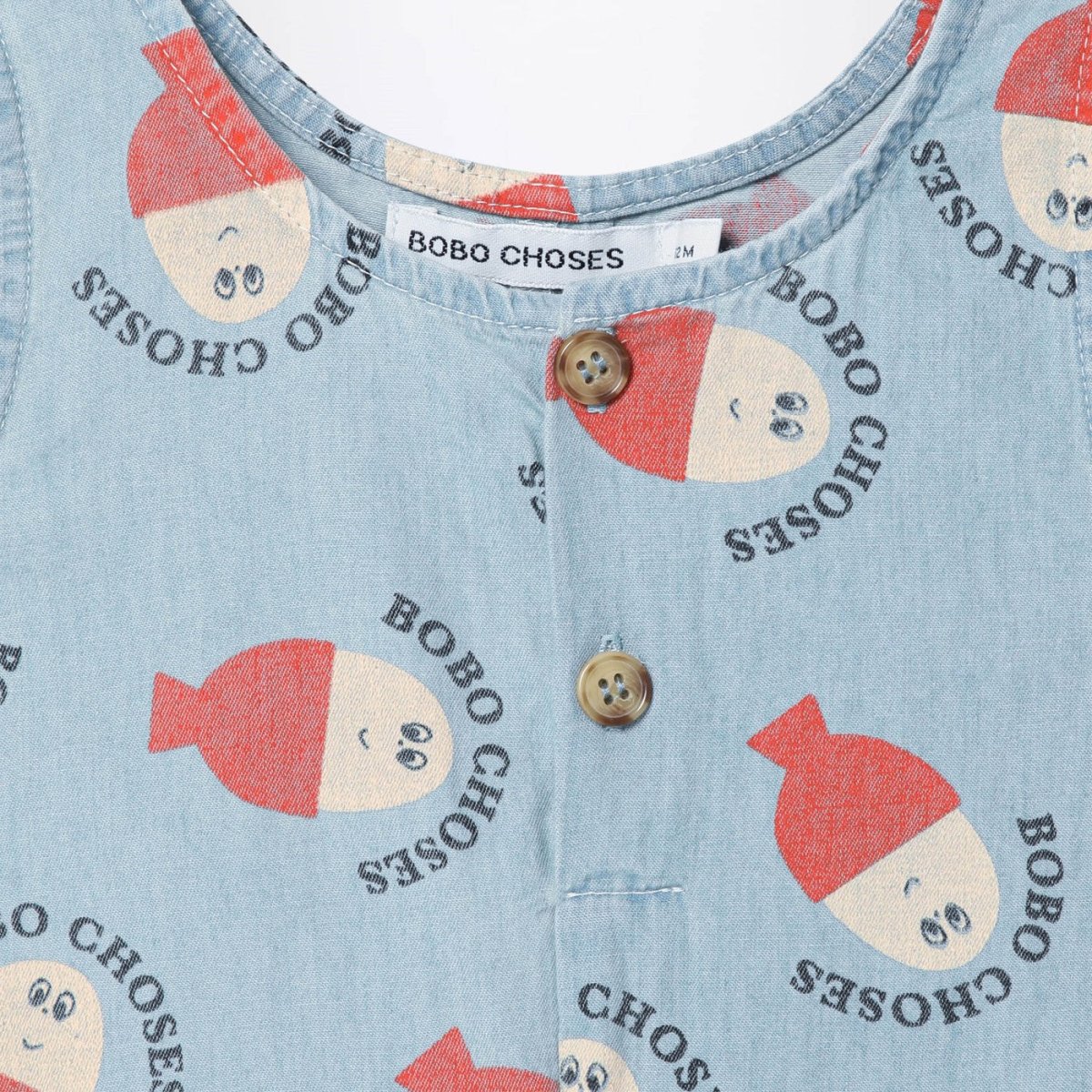 Tutina girocollo smanicata di Bobo Choses in cotone azzurra, caratterizzata da bottoncini sul davanti, bottoncini a pressione sul cavallo e logo lettering con Morning Egg all over.