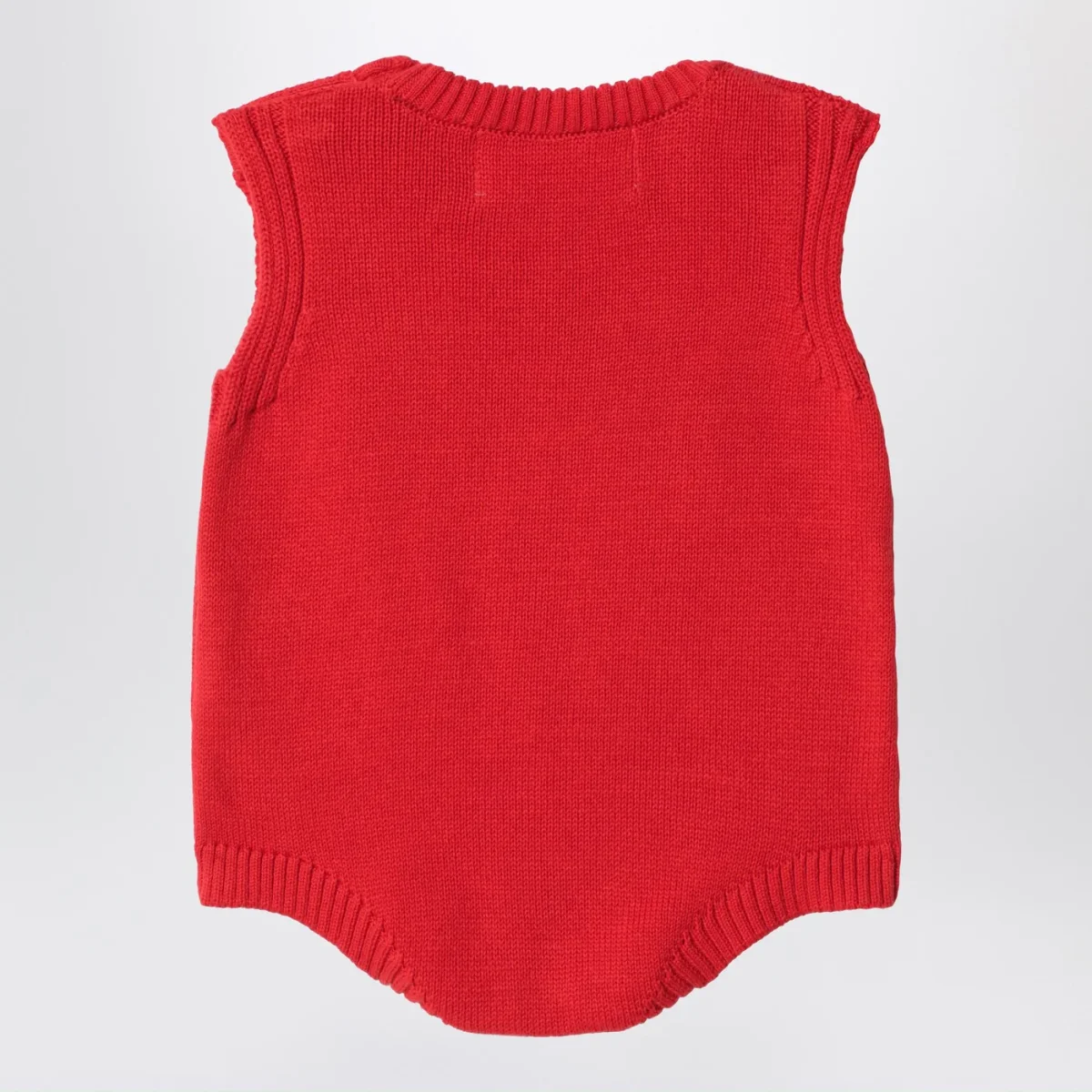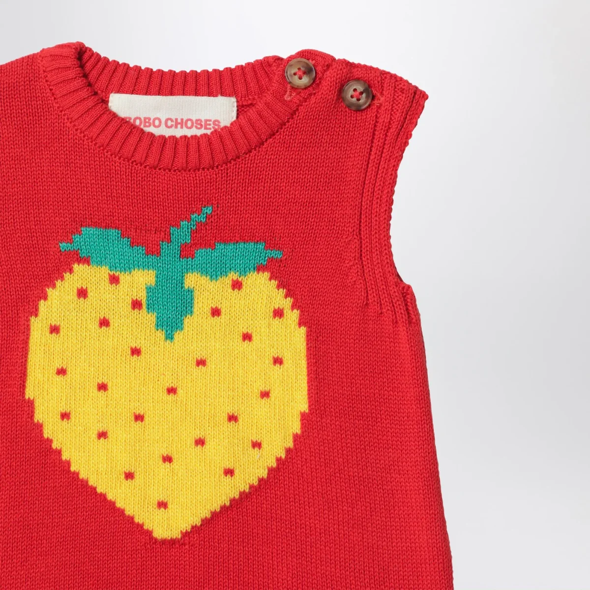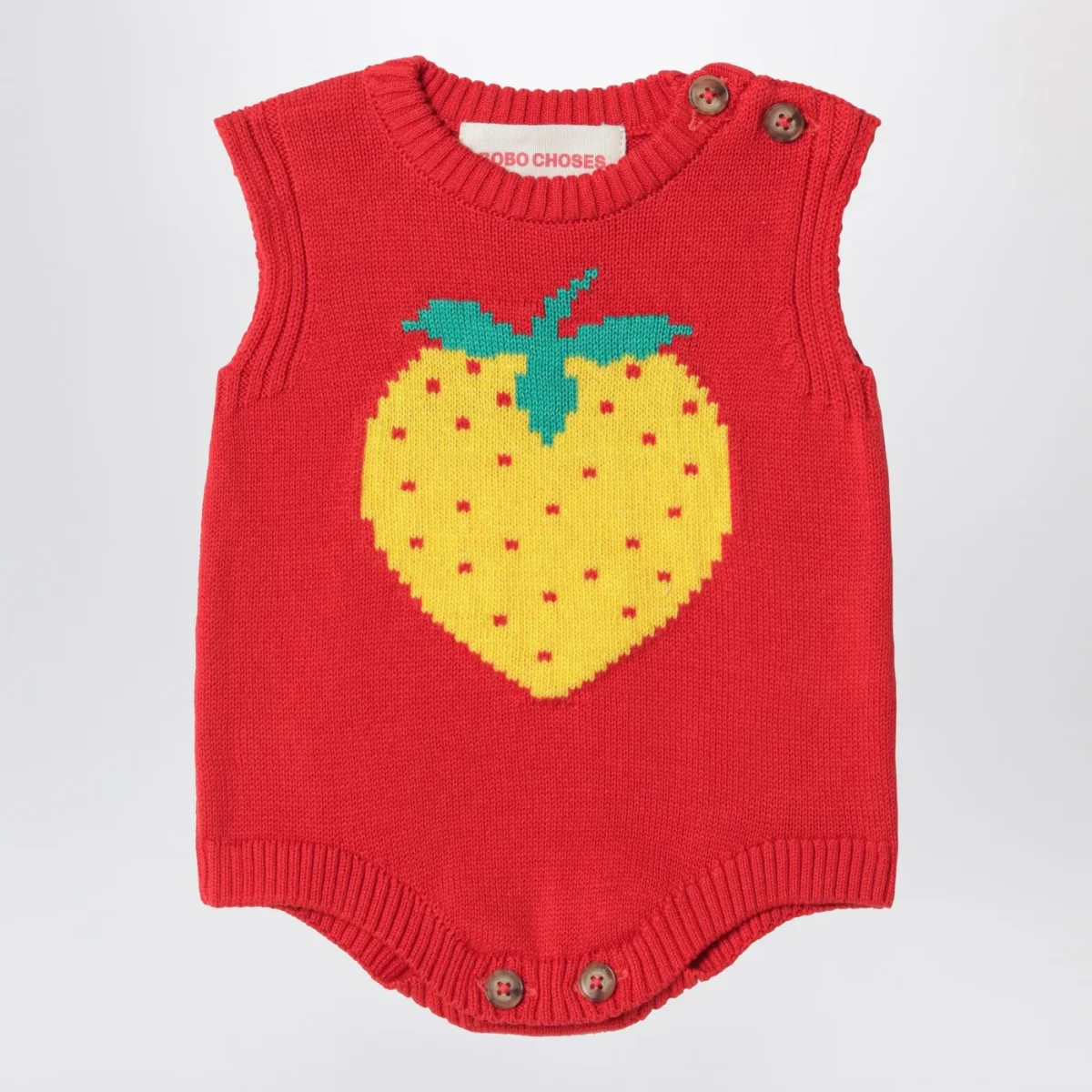 Tutina girocollo smanicata di Bobo Choses in maglia di cotone rossa• Bottoncini sul cavallo e sulla spalla• Fragola intarsiata sul davanti• Bordi a costine