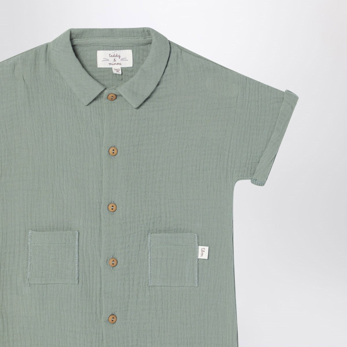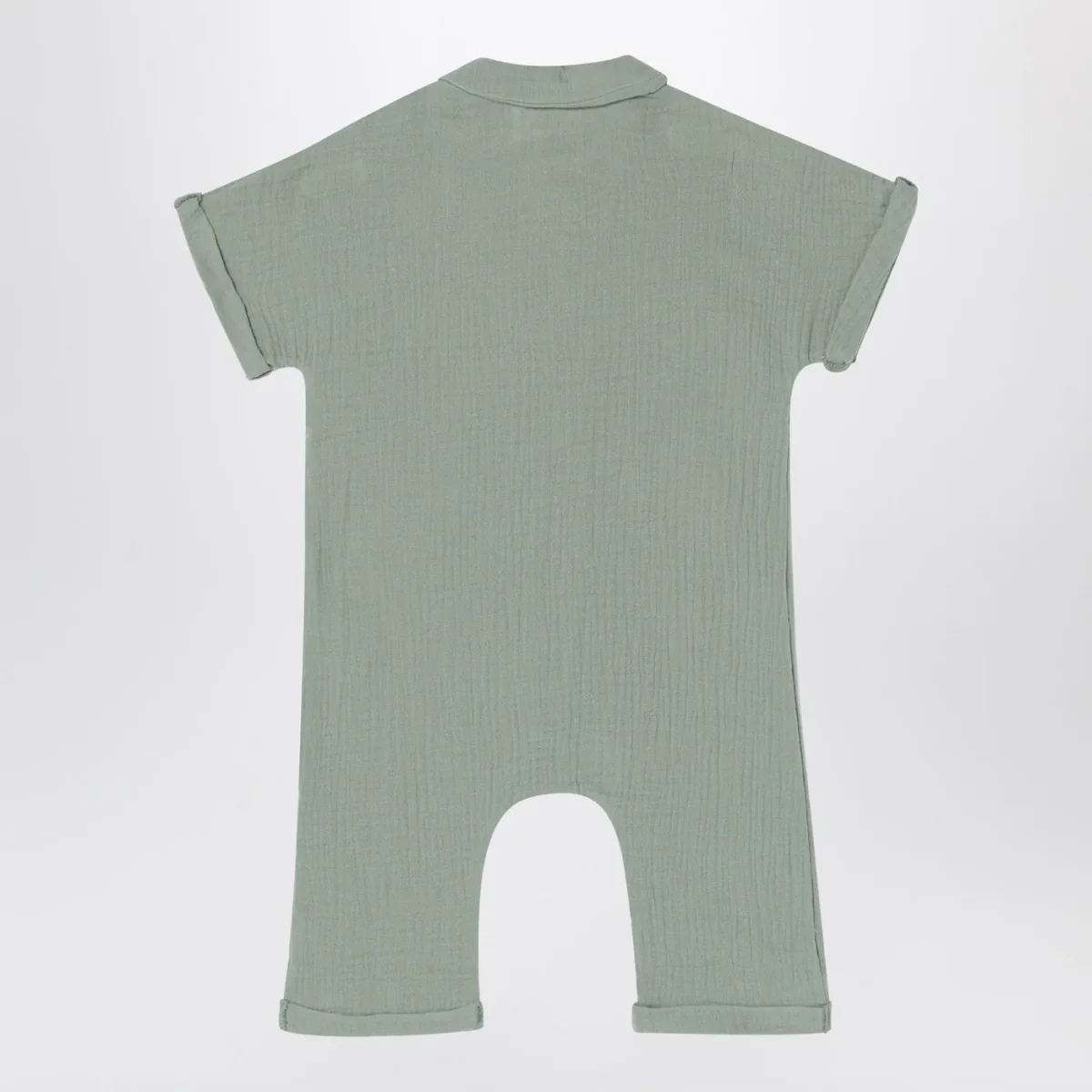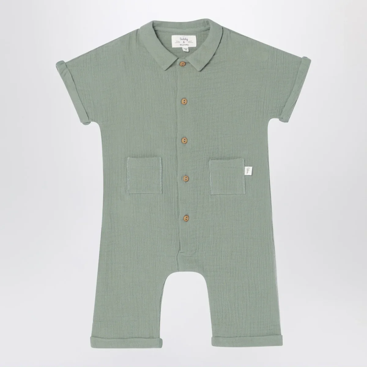 Tutina di Teddy & Minou in garza di cotone verde salvia, caratterizzata da manica corta, bottoncini sul davanti e due tasche applicate sul davanti con piccolo patch logo.