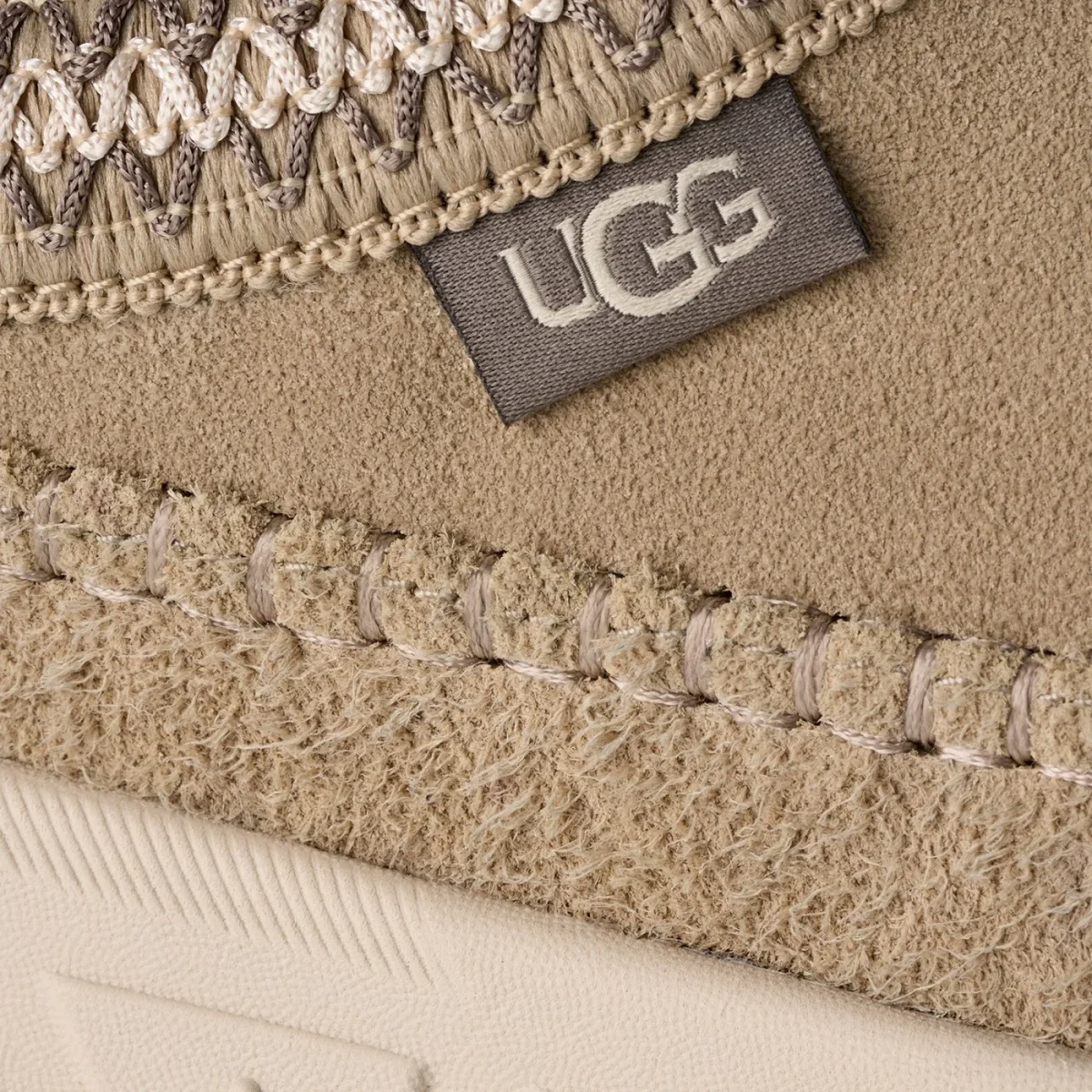 Calzatura di UGG in pelle scamosciata color senape, caratterizzata da punta tonda, cuciture a contrasto, targhetta logo e maxi suola color ceramica in gomma con logo lettering in rilievo.