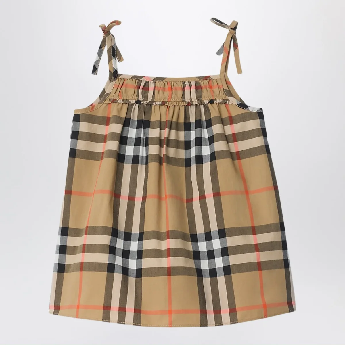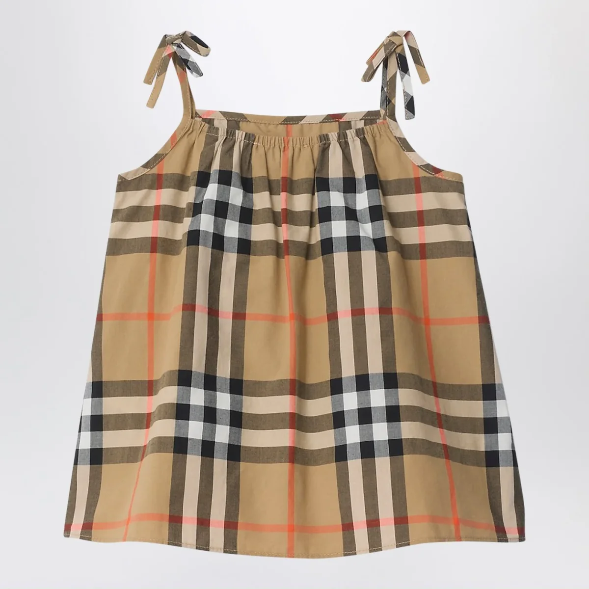 Completo di Burberry in cotone leggero beige sabia con motivo Check• composto da vestitino in cotone con pannello anteriore arricciato• fiocchi sulle spalline• pantaloncini bloomer coordinati con vita elasticizzata