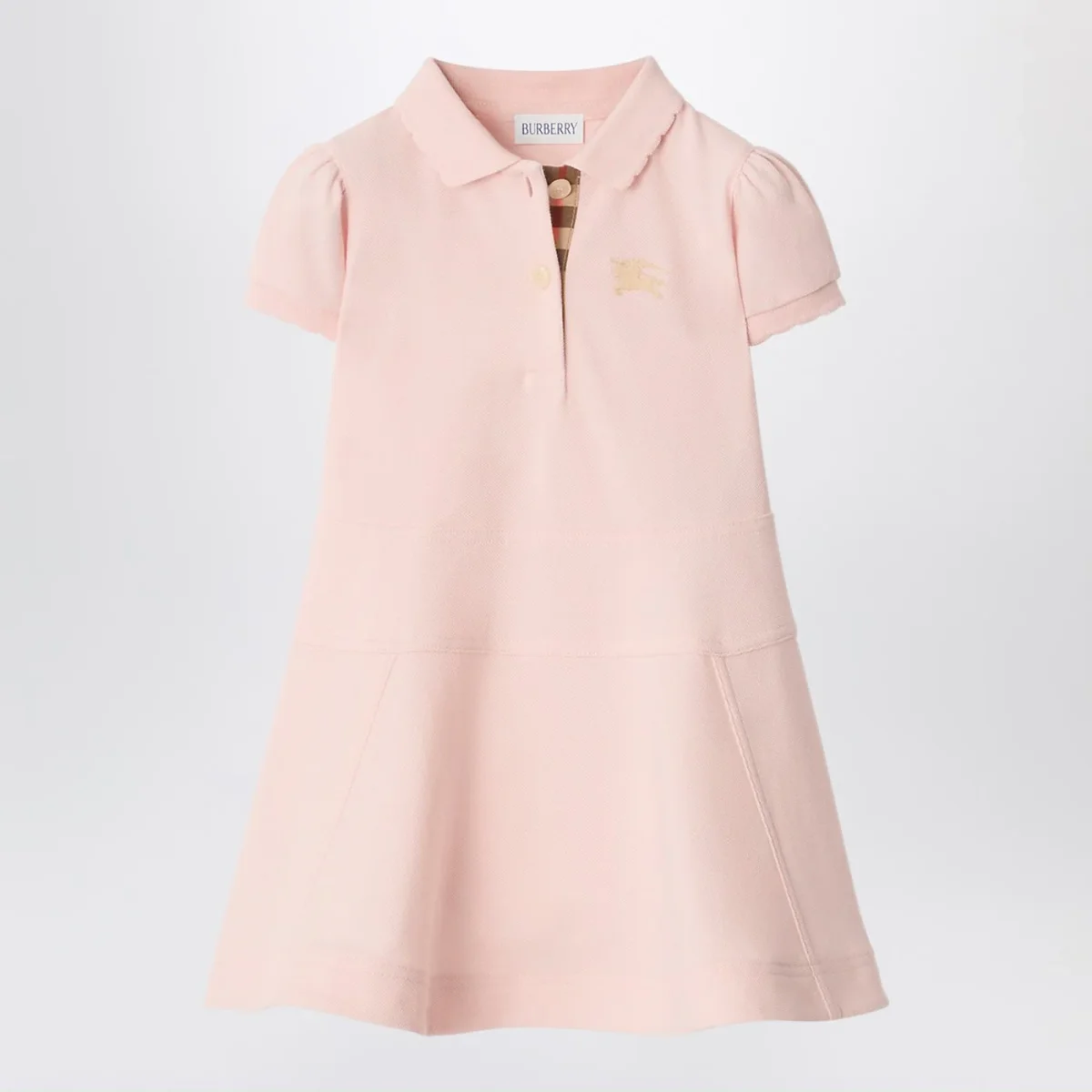 Vestitino di Burberry in cotone piqué rosa• bottoncini sul davanti con interno con motivo Check beige• gonna svasata• maniche corte a sbuffo con finiture smerlate• Equestrian Knight Design ricamato sul petto