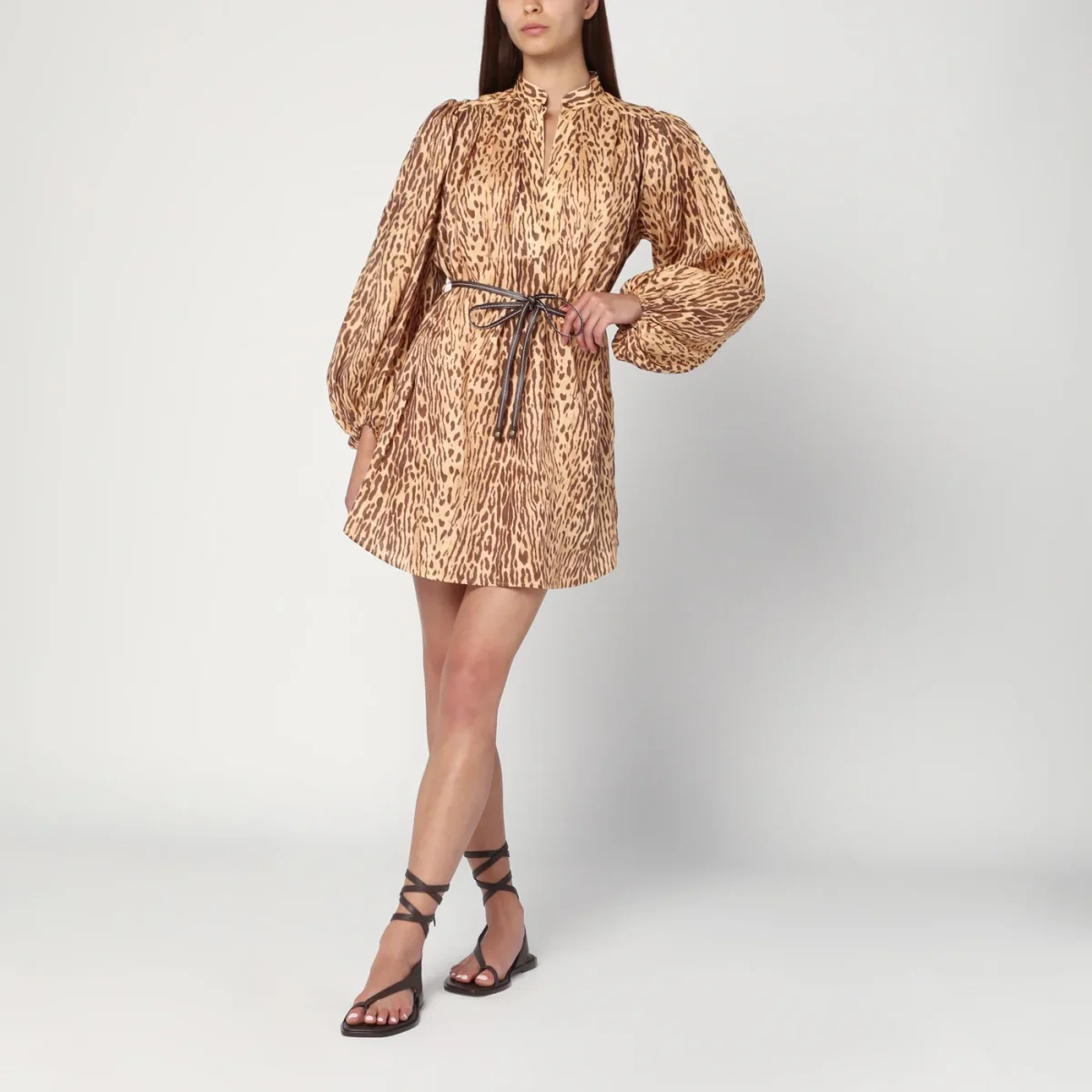 Vestito corto di Zimmermann in lino caratterizzato da colletto alla coreana, bottone frontale, maniche lunghe a palloncino, polsini elasticizzati e cintura in vita abbinata.