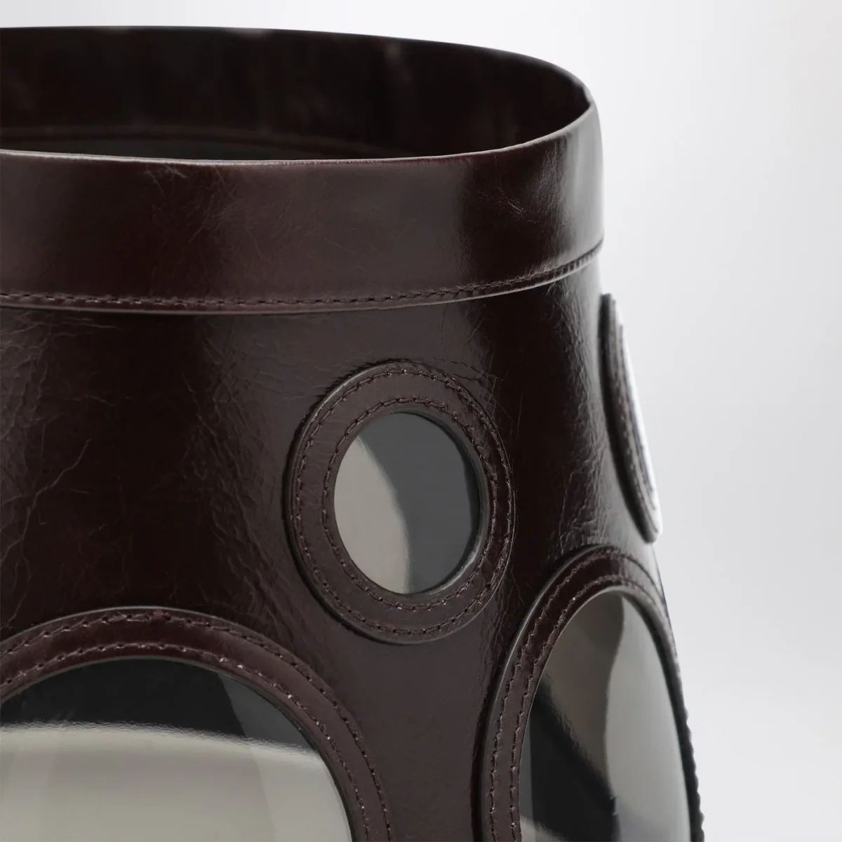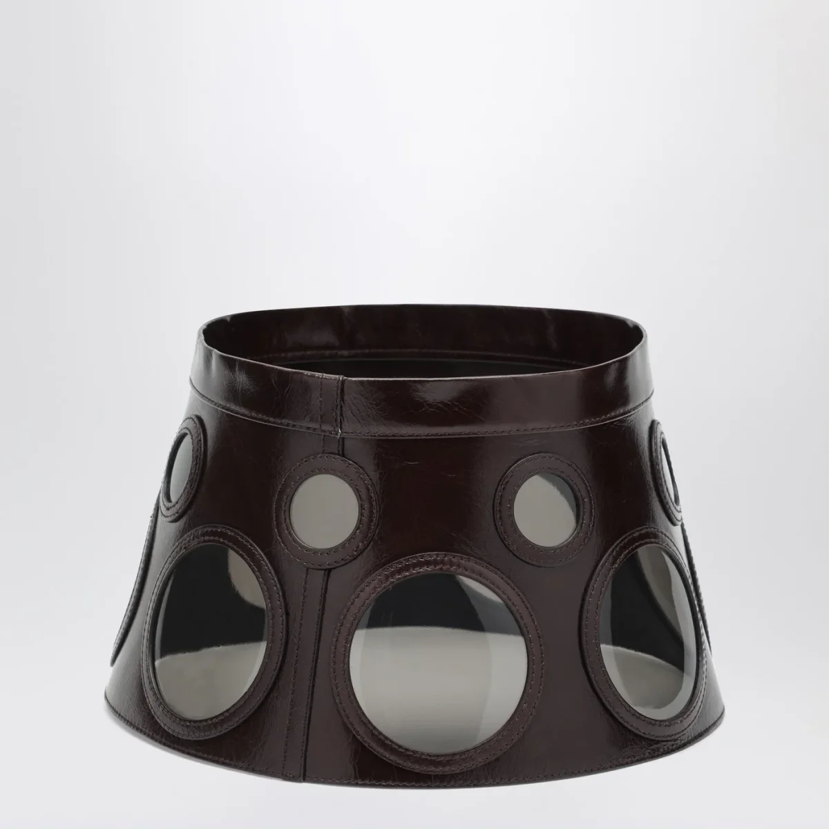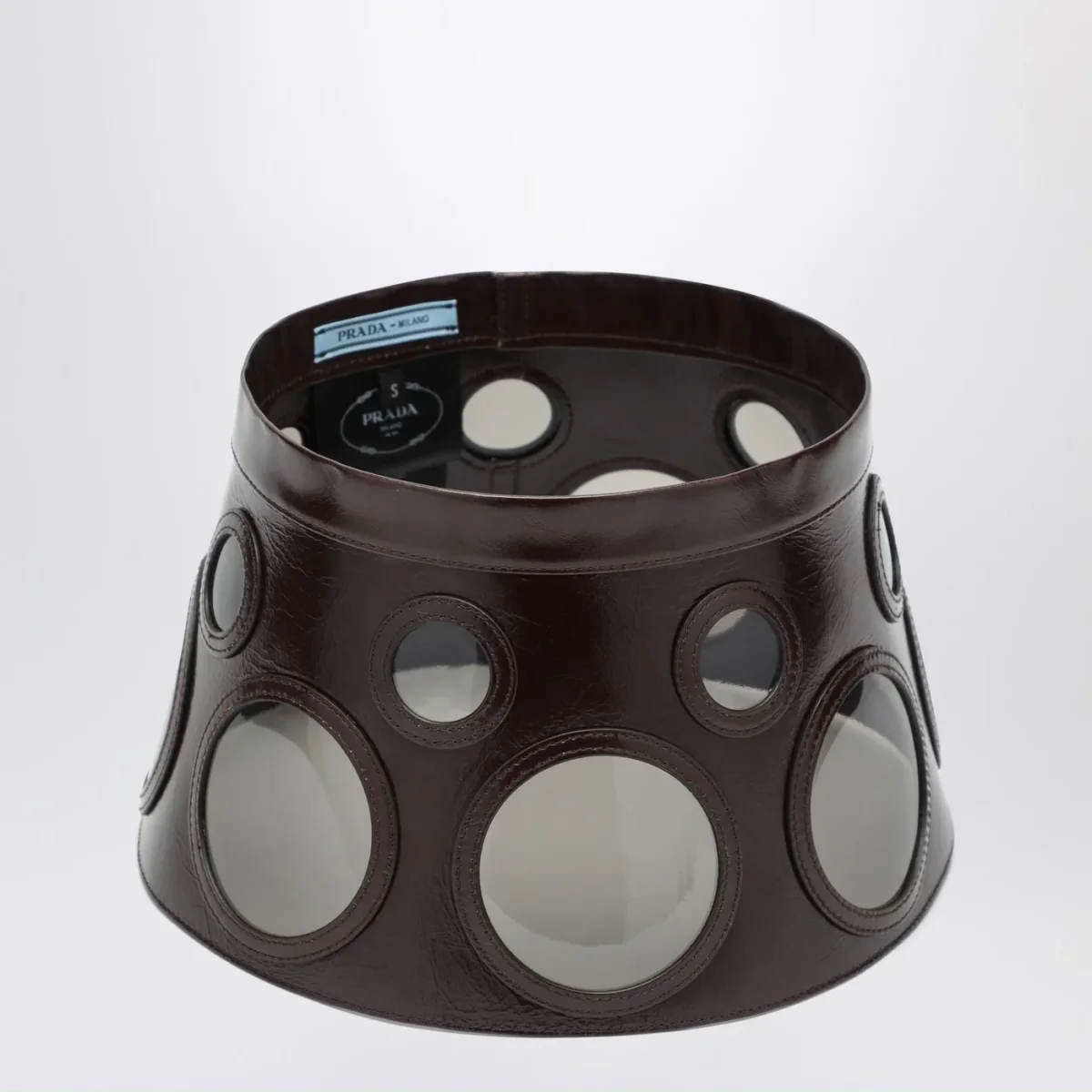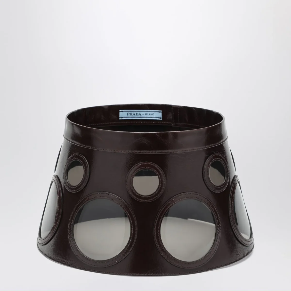 Visiera di Prada in pelle marrone con lenti rotonde in plex.