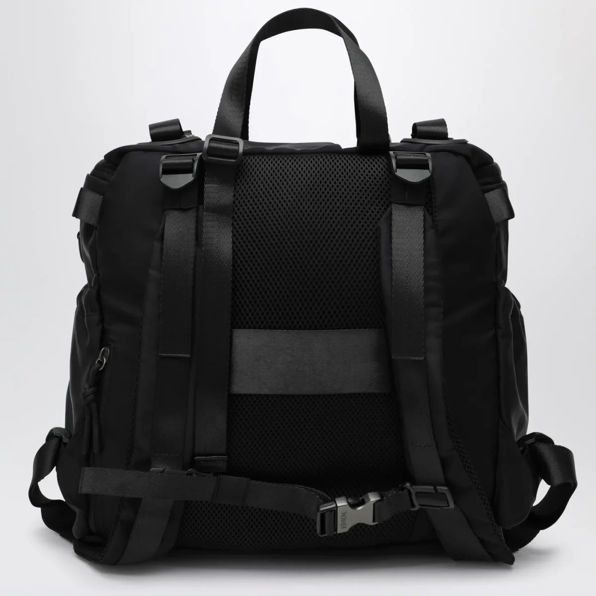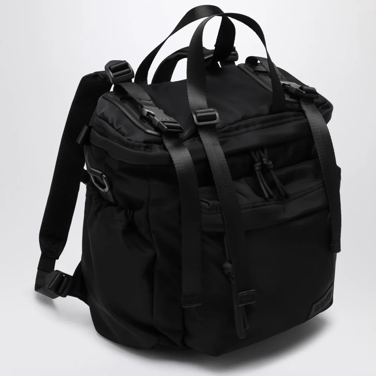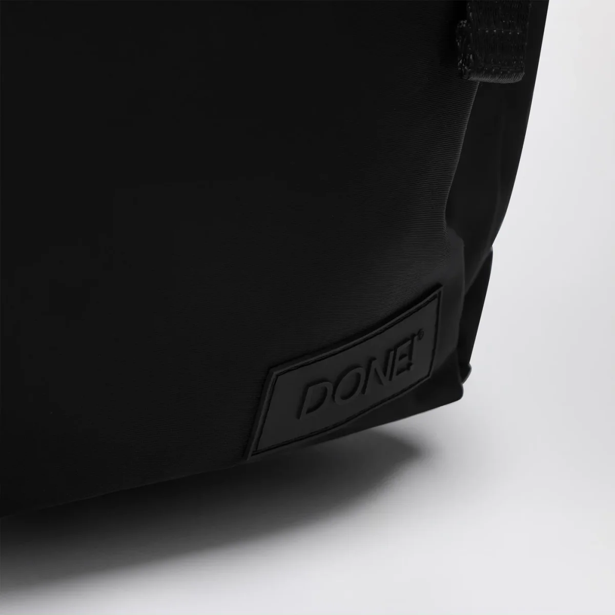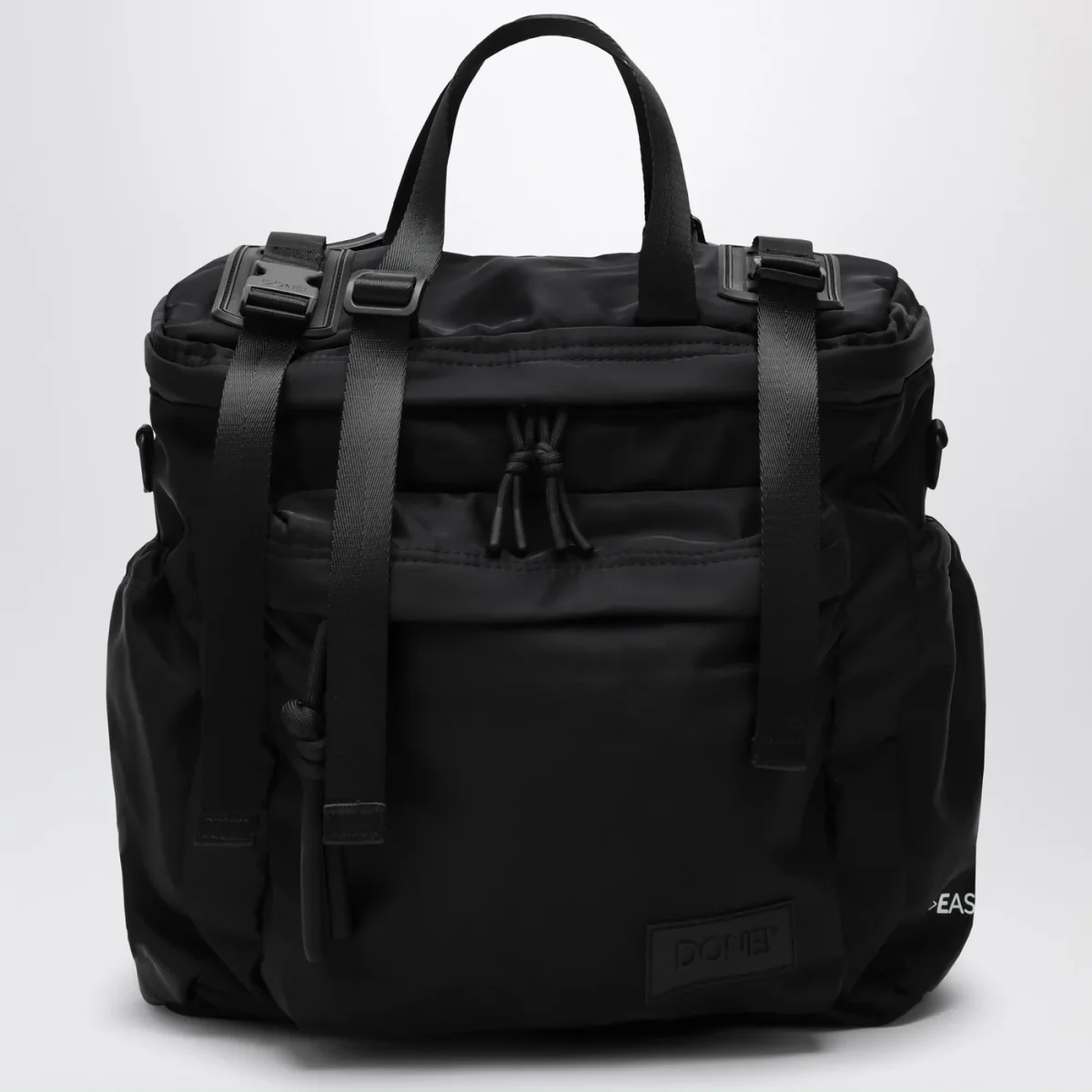 Zaino di DONE! In nylon riciclato waterproof nero, caratterizzato da design orizzontale, chiusura con zip, uno scomparto principale, una tasca frontale con zip, due tasche laterali con coulisse, una tasca interna imbottita, una tasca a rete interna porta oggetti con moschettone portachiavi, una tasca di sicurezza posizionata sullo schienale, spallacci rimovibili imbottiti, fodera interna a contrasto e una tasca interna rimovibile.