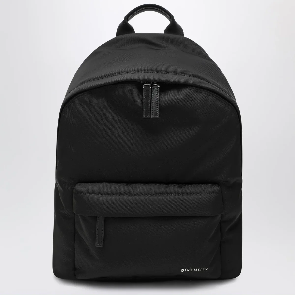 Zaino piccolo di Givenchy in nylon nero, caratterizzato da chiusura con cerniera e tiralampo doppia in pelle, firma logo in metallo sul davanti, spallacci imbottiti regolabili, tasca anteriore con cerniera e una tasca interna piatta.