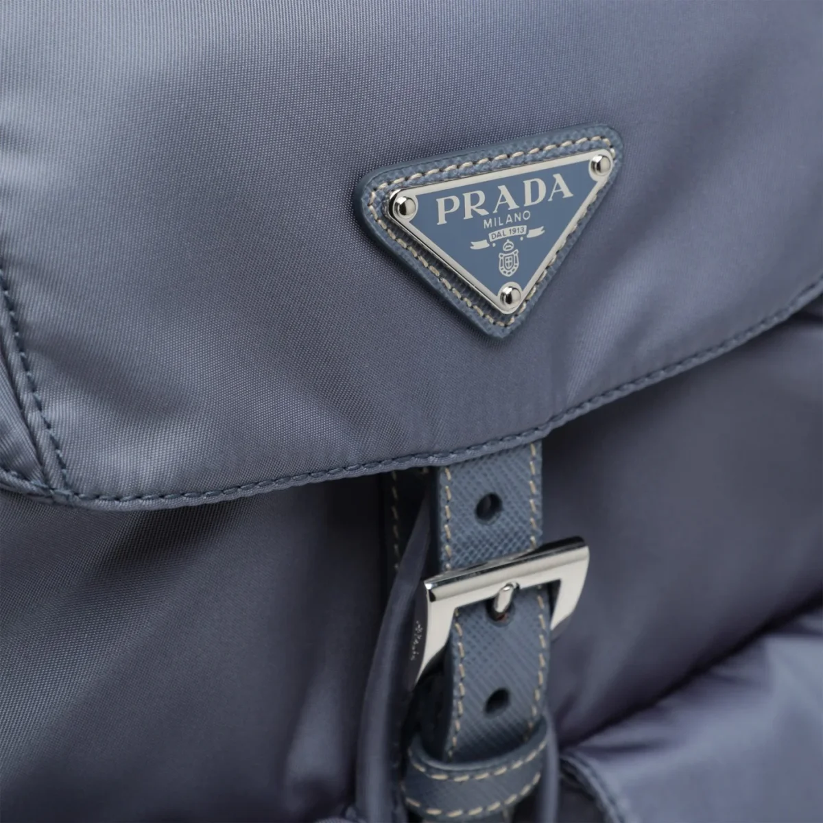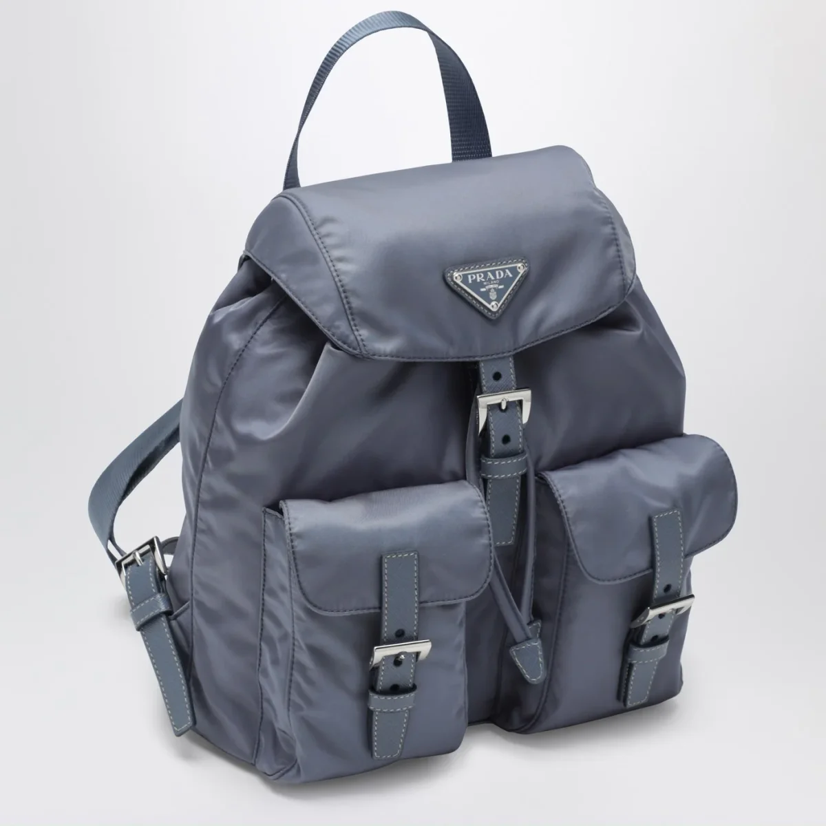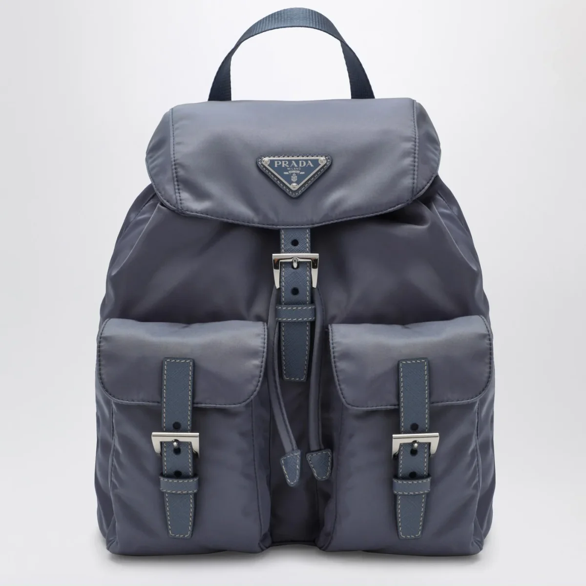 Zaino di Prada in nylon riciclato color azzurro aviatore, caratterizzato da chiusura a pattina con fibbia regolabile e coulisse, inserti in pelle Saffiano, una maniglia in tessuto, due bretelle regolabili, due tasche applicate frontali con patta e fibbia, hardware in metallo color argento, logo triangolo in metallo smaltato sul davanti e una tasca piatta interna con zip.