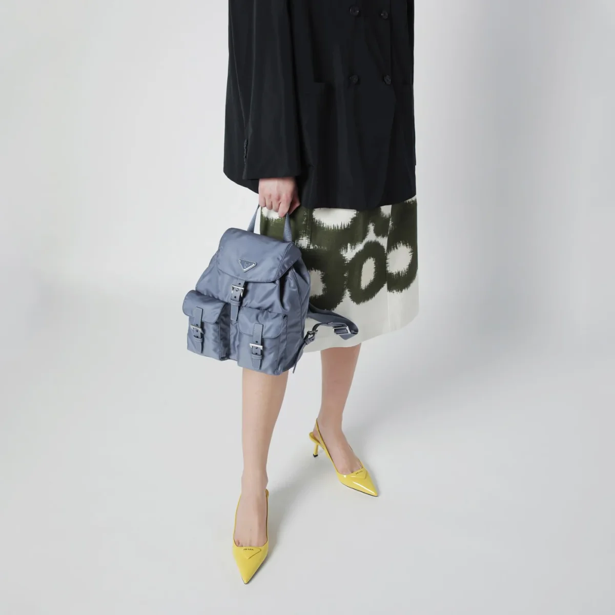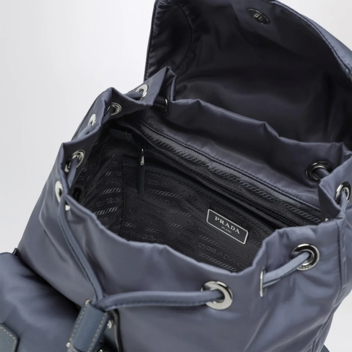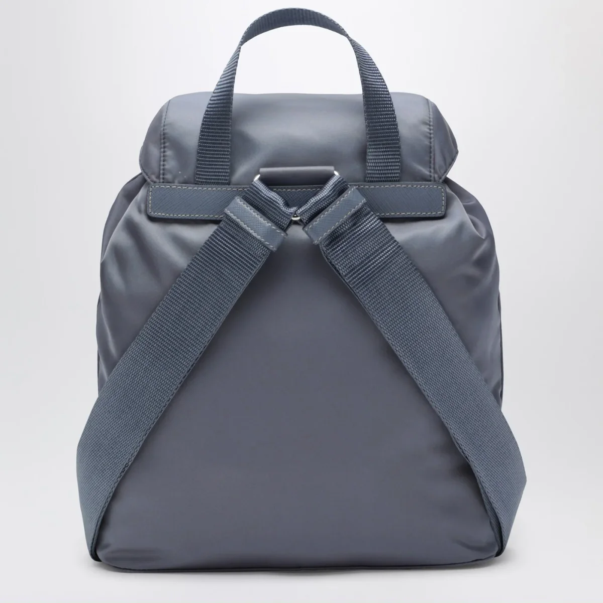Zaino di Prada in nylon riciclato color azzurro aviatore, caratterizzato da chiusura a pattina con fibbia regolabile e coulisse, inserti in pelle Saffiano, una maniglia in tessuto, due bretelle regolabili, due tasche applicate frontali con patta e fibbia, hardware in metallo color argento, logo triangolo in metallo smaltato sul davanti e una tasca piatta interna con zip.