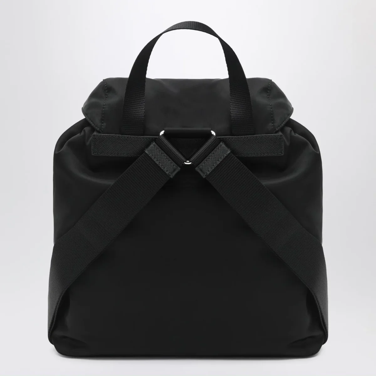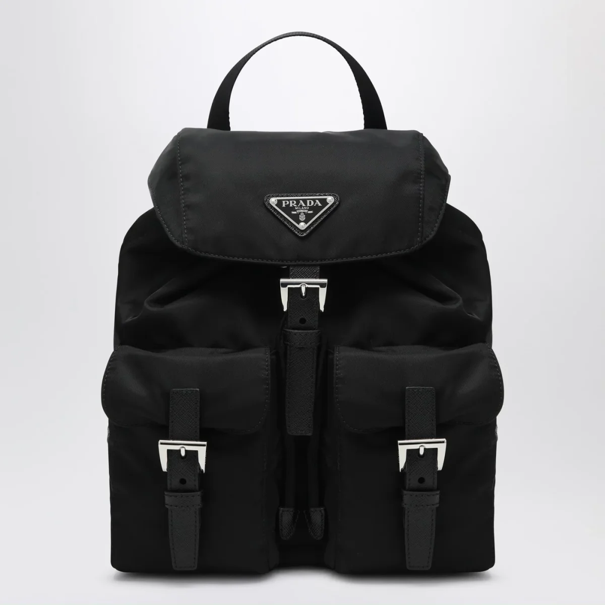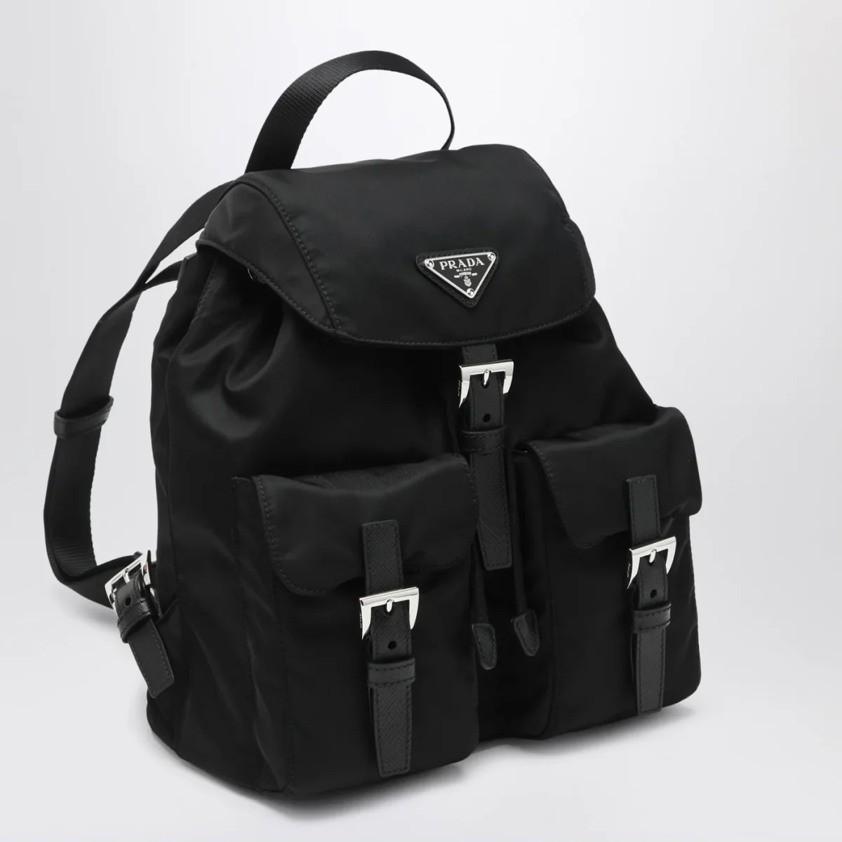Zaino di Prada in nylon riciclato nero• chiusura a pattina con fibbia regolabile e coulisse• inserti in pelle Saffiano• una maniglia in tessuto• due bretelle regolabili• due tasche applicate frontali con patta e fibbia• hardware in metallo color argento• logo triangolo in metallo smaltato sul davanti• una tasca piatta interna con zip
