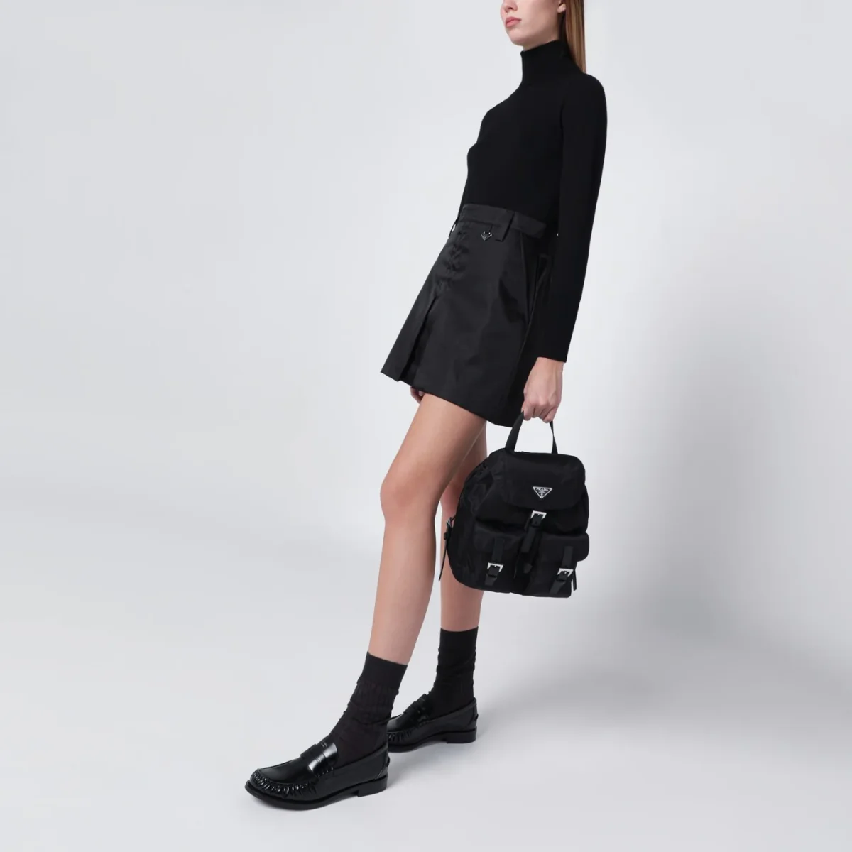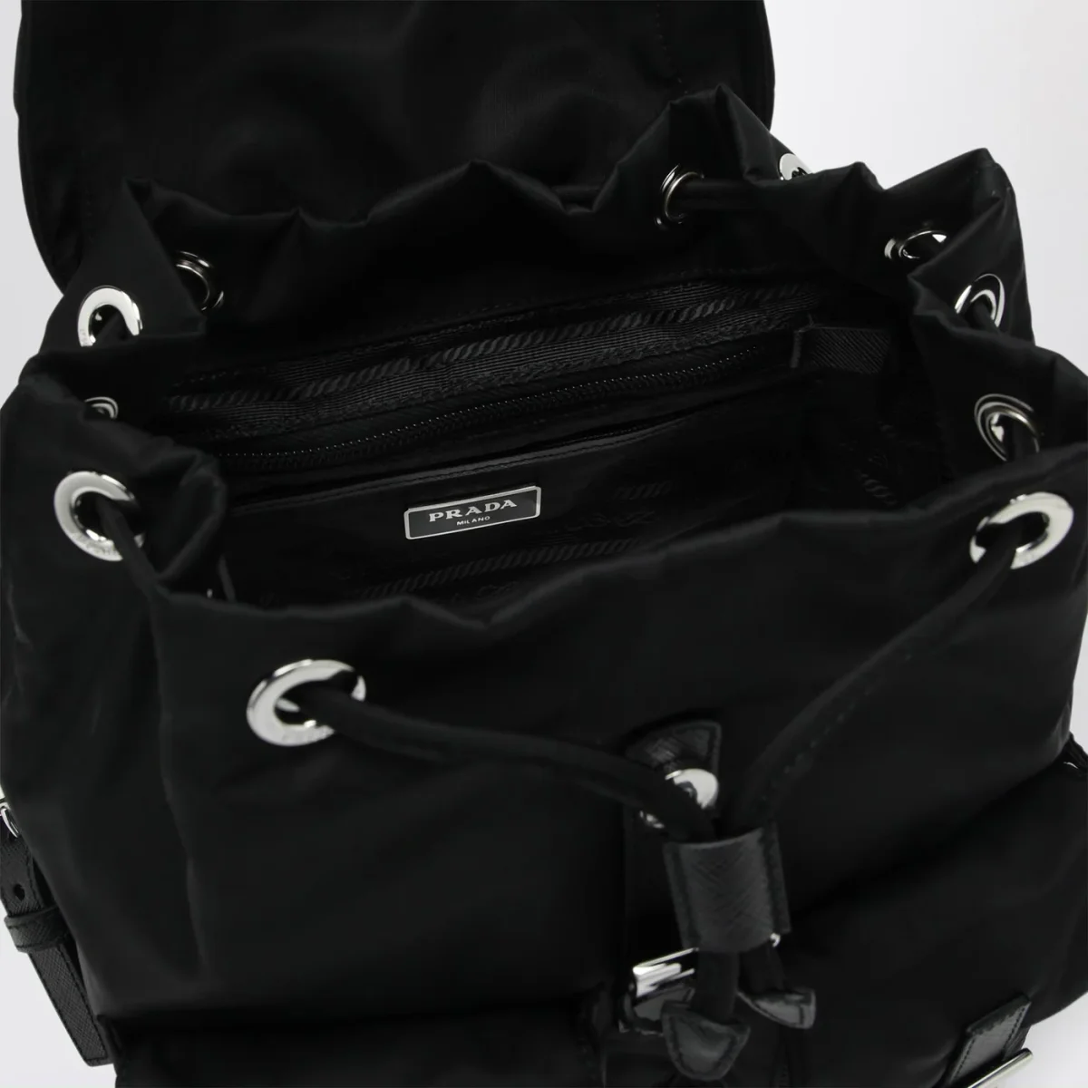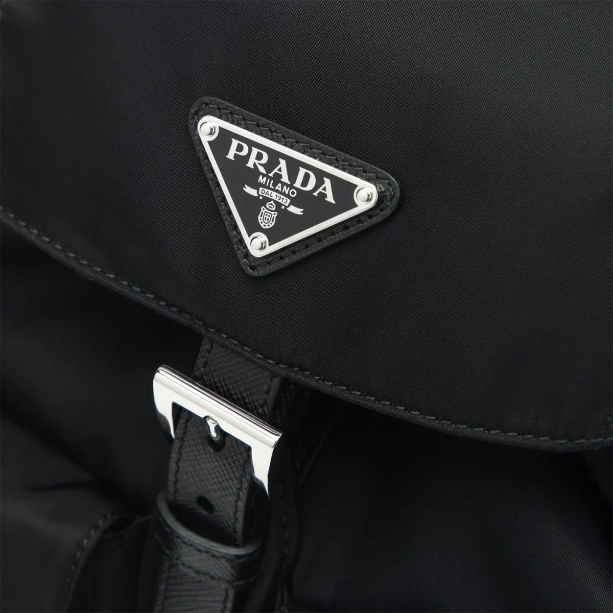 Zaino di Prada in nylon riciclato nero• chiusura a pattina con fibbia regolabile e coulisse• inserti in pelle Saffiano• una maniglia in tessuto• due bretelle regolabili• due tasche applicate frontali con patta e fibbia• hardware in metallo color argento• logo triangolo in metallo smaltato sul davanti• una tasca piatta interna con zip